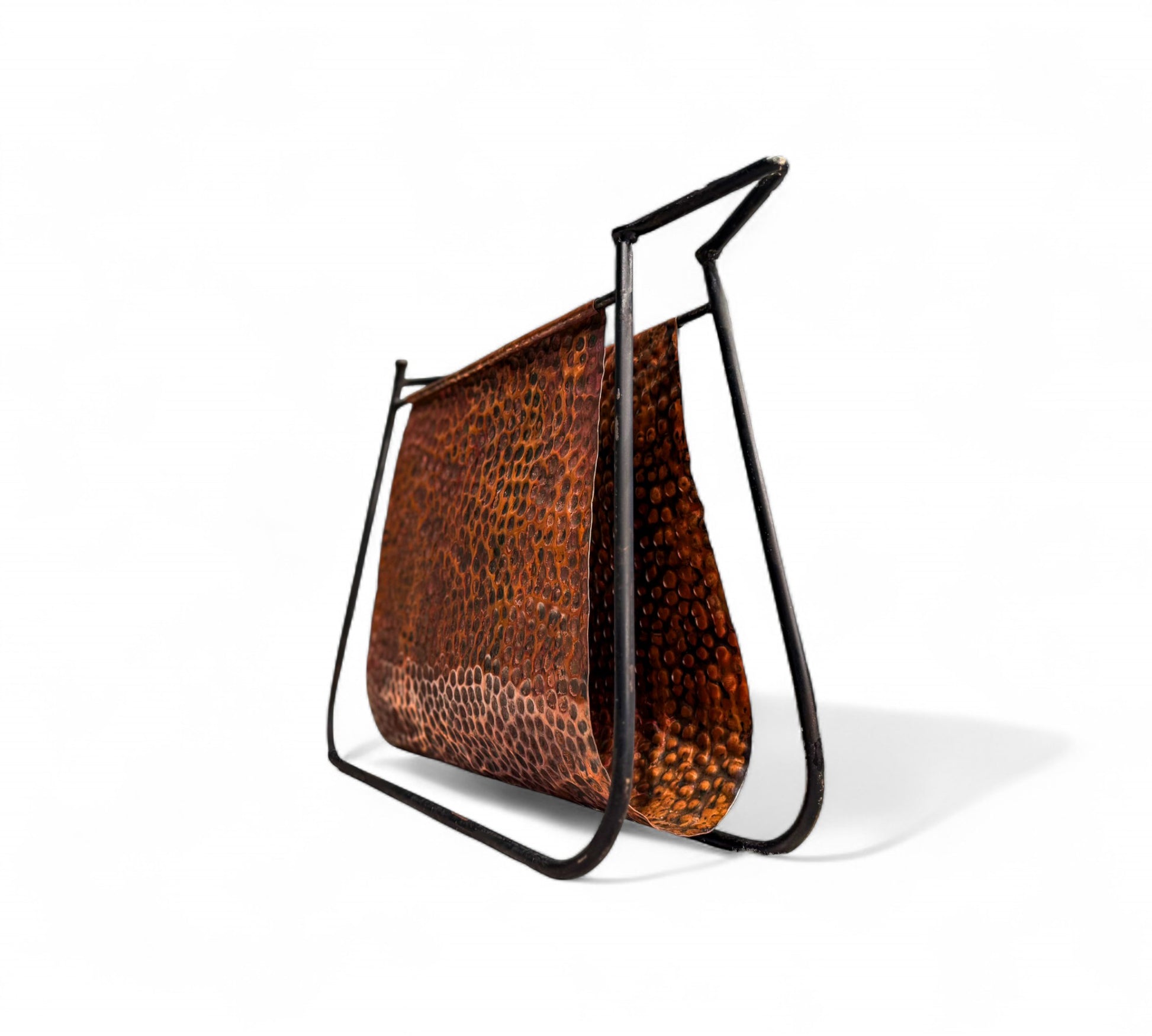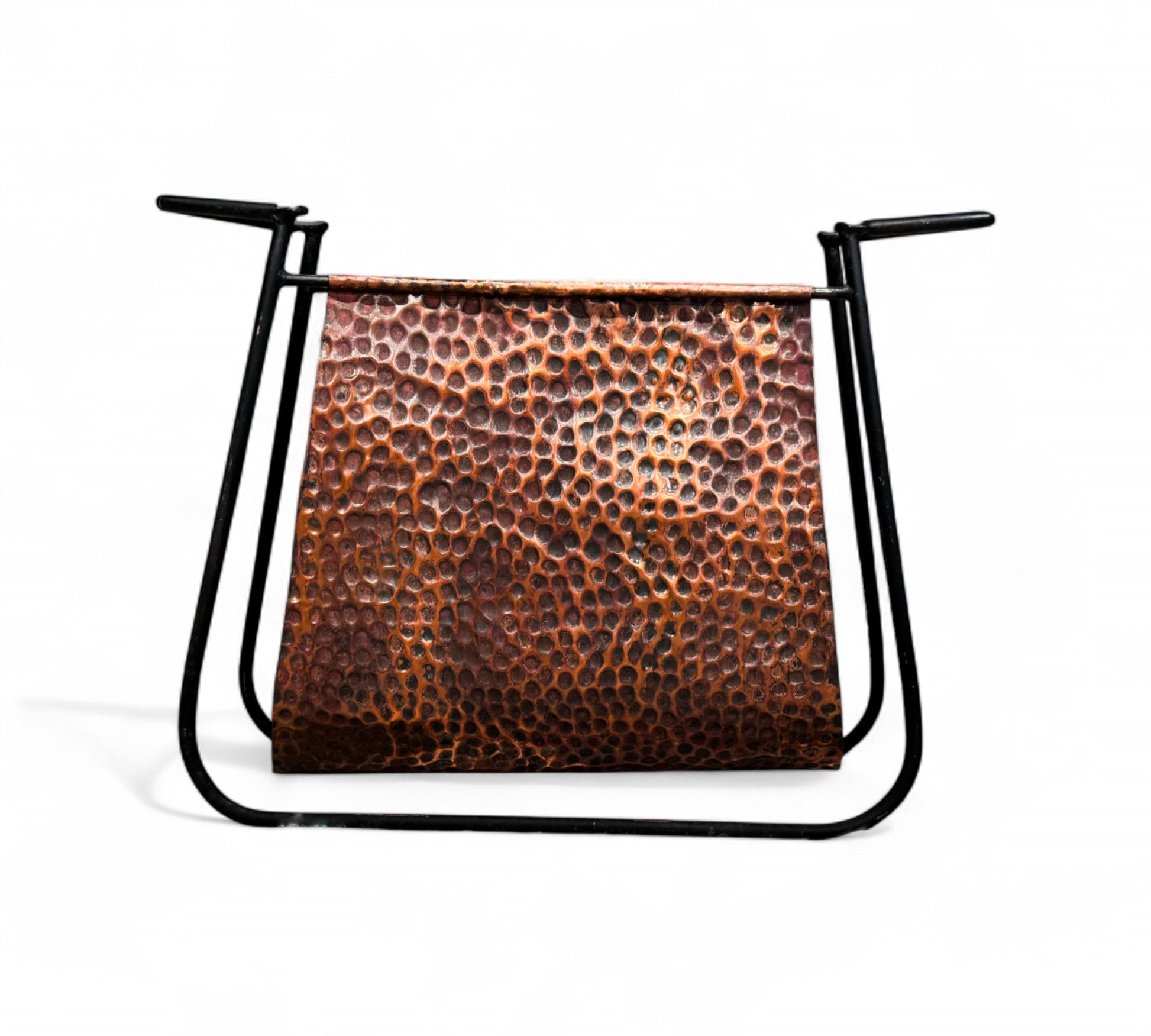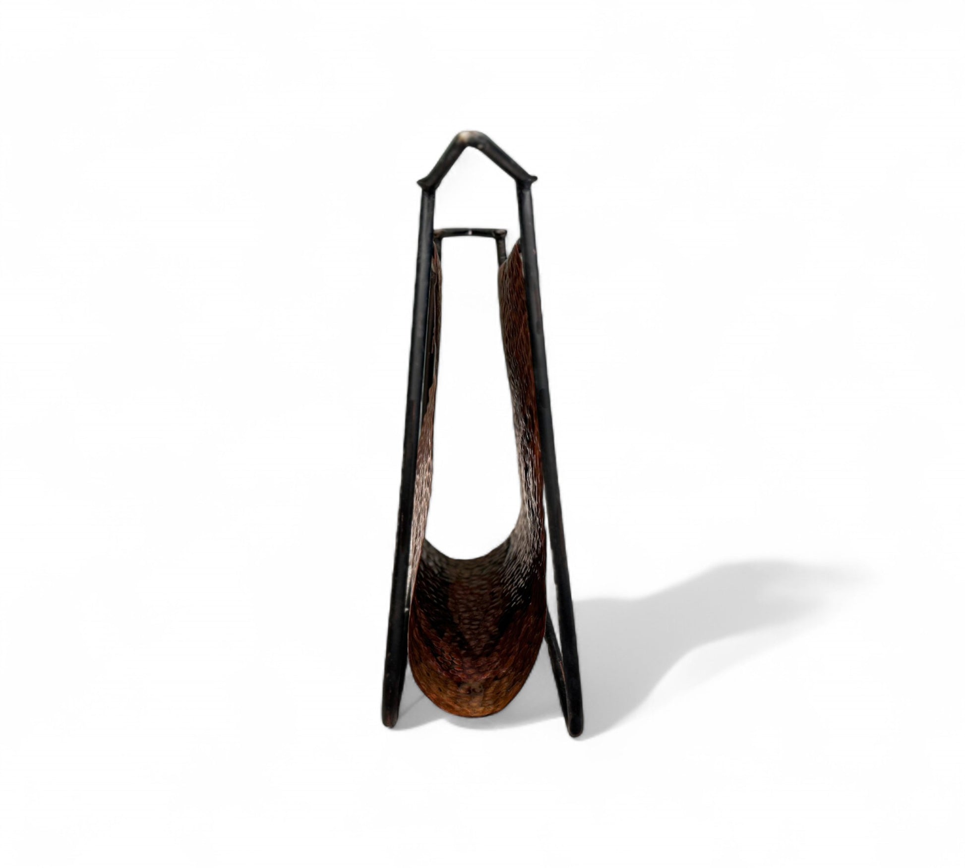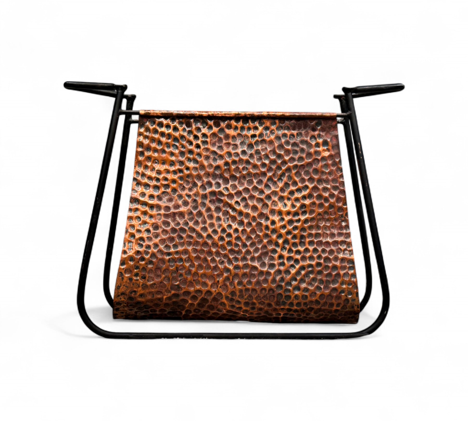 This is a decorative magazine rack featuring a hammered copper sling suspended within a minimalist black metal frame. The copper has a textured, dimpled finish that adds visual interest and a rustic charm. The black metal frame is sleek and modern, contrasting nicely with the warm tones of the copper. The design is both functional and stylish, suitable for holding magazines, newspapers, or books in a living room or office setting.