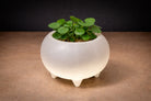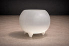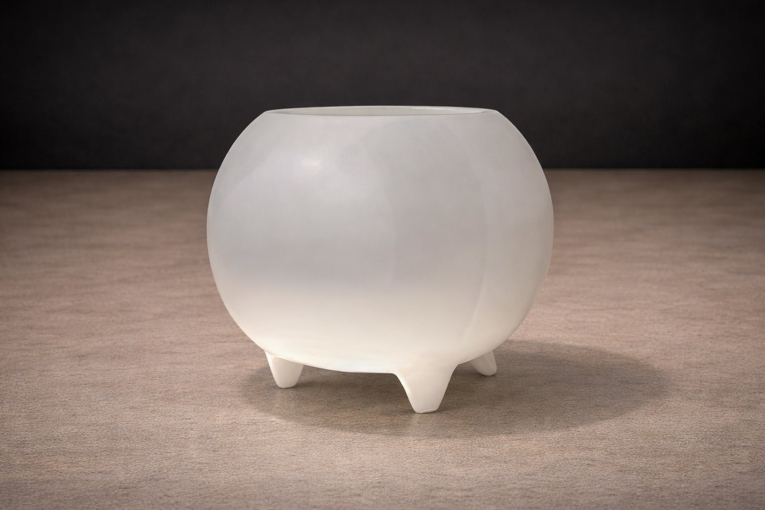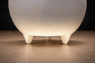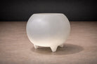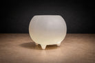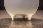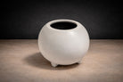 The vessel is defined by a rounded, near-spherical body resting on four subtly tapered legs. This elevated base introduces both stability and visual lightness, lifting the volume slightly above the surface and creating a measured sense of suspension. The matte white finish softens the contours of the clay, allowing the silhouette to remain the primary expressive element. Gentle planar shifts across the surface reveal the hand-built nature of the form, while the restrained geometry reinforces structural clarity.