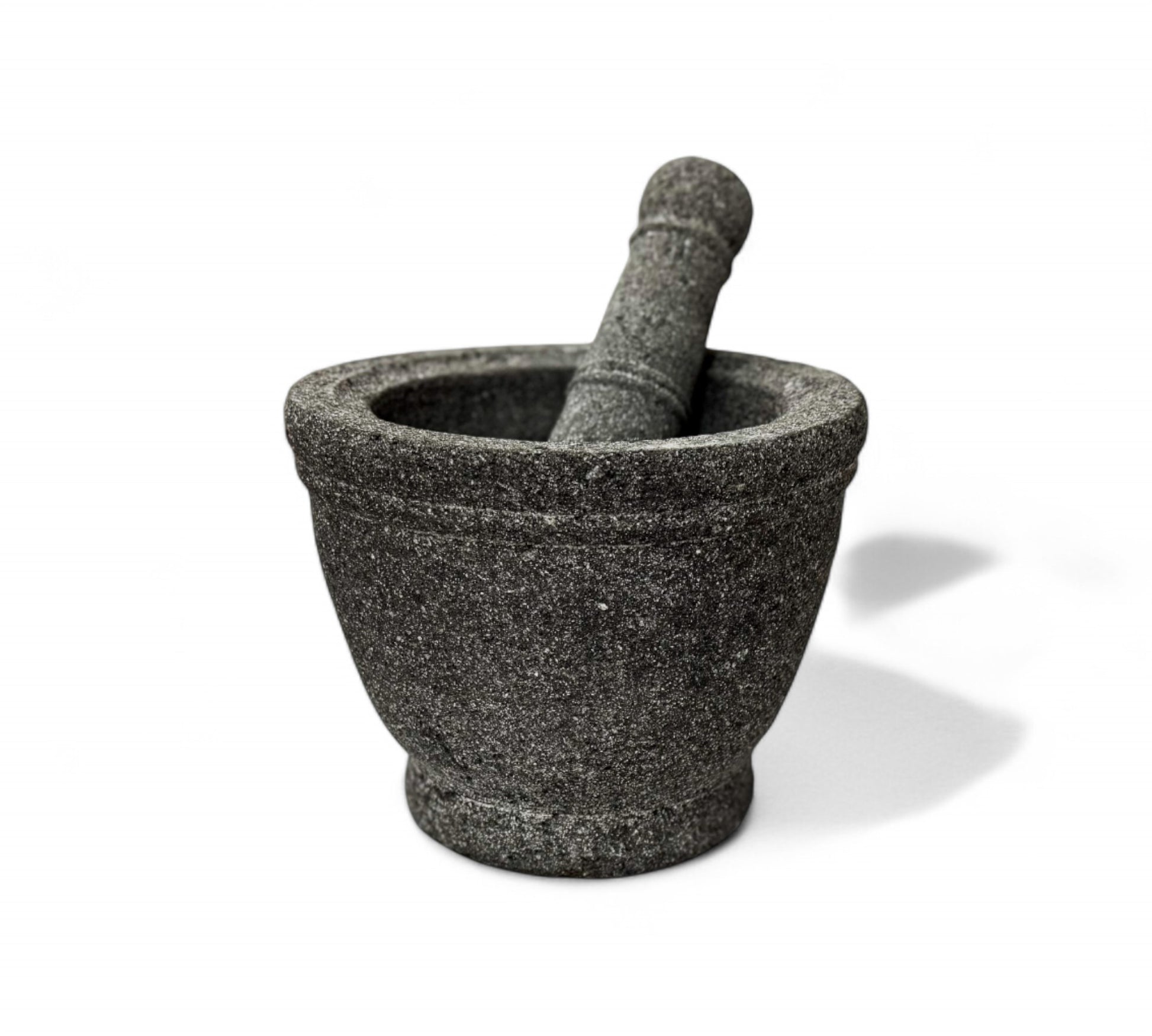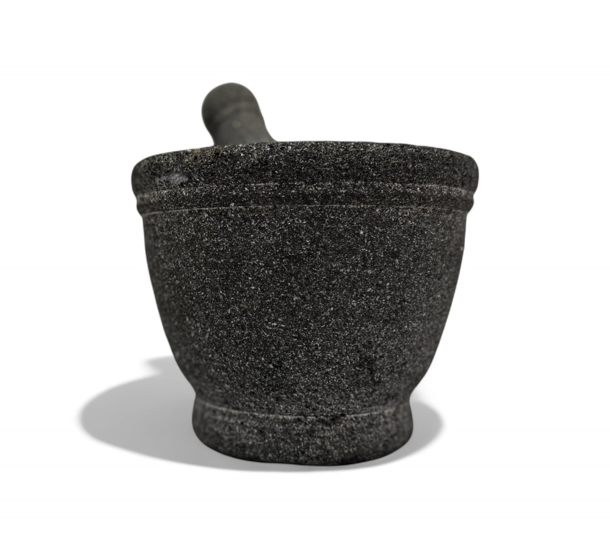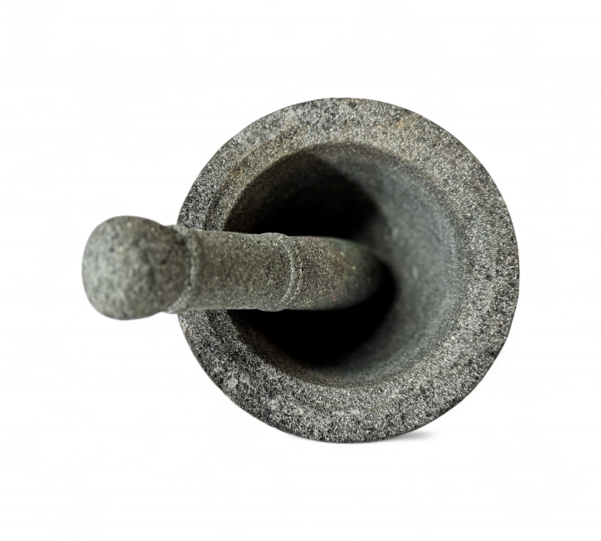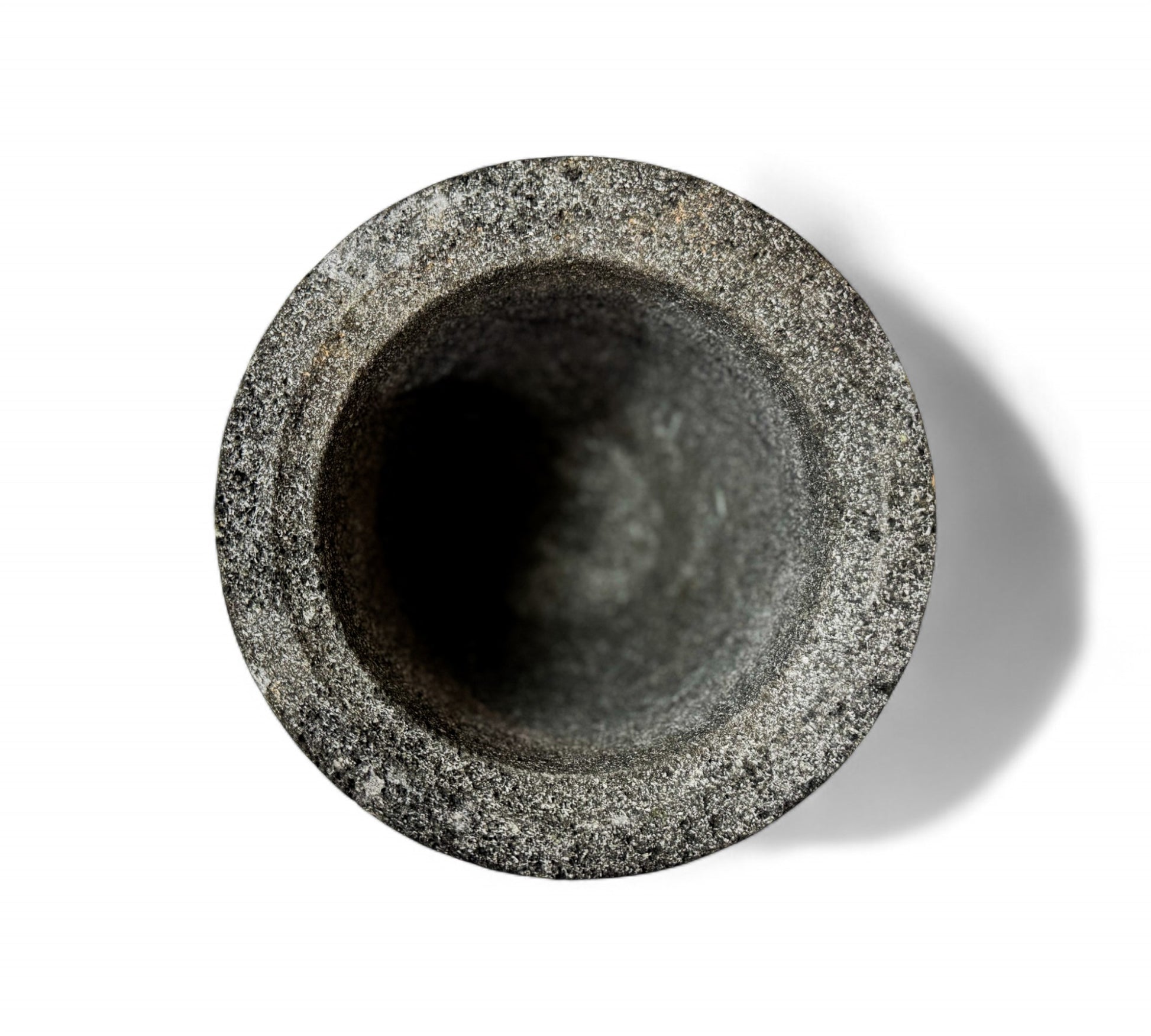 This image shows a beautifully hand-carved molcajete, a traditional Mexican mortar and pestle, designed in 2016 by Taller Maya, a collective that works with Mayan artisans in the Yucatán Peninsula. Crafted from volcanic stone, this molcajete is both a functional kitchen tool and a cultural artifact, reflecting centuries-old traditions of grinding spices, herbs, and seeds. The coarse surface of the volcanic rock is ideal for creating richly textured salsas and pastes. The piece represents a commitment to cultural preservation, sustainable practices, and artisan empowerment. Its clean, elegant form is rooted in ancient utility, yet timeless enough to be used in modern kitchens around the world.
