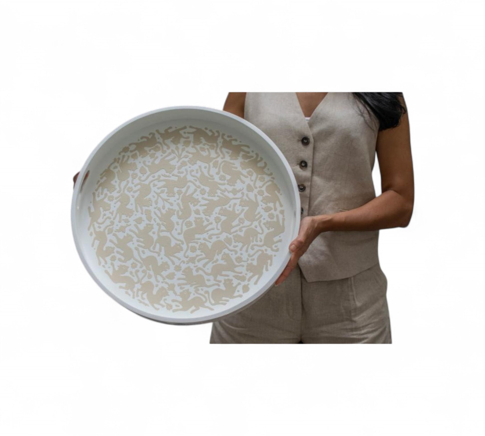 This Beige Ocelote Tray, created by Ensamble Artesano, merges functionality with cultural artistry. Made from high-quality wood and adorned with natural pigments, the tray features a white and beige color palette, achieved through the traditional lacquer technique known as “Maque,” gives it a timeless elegance suitable for any setting.
