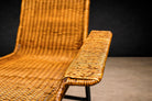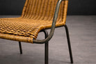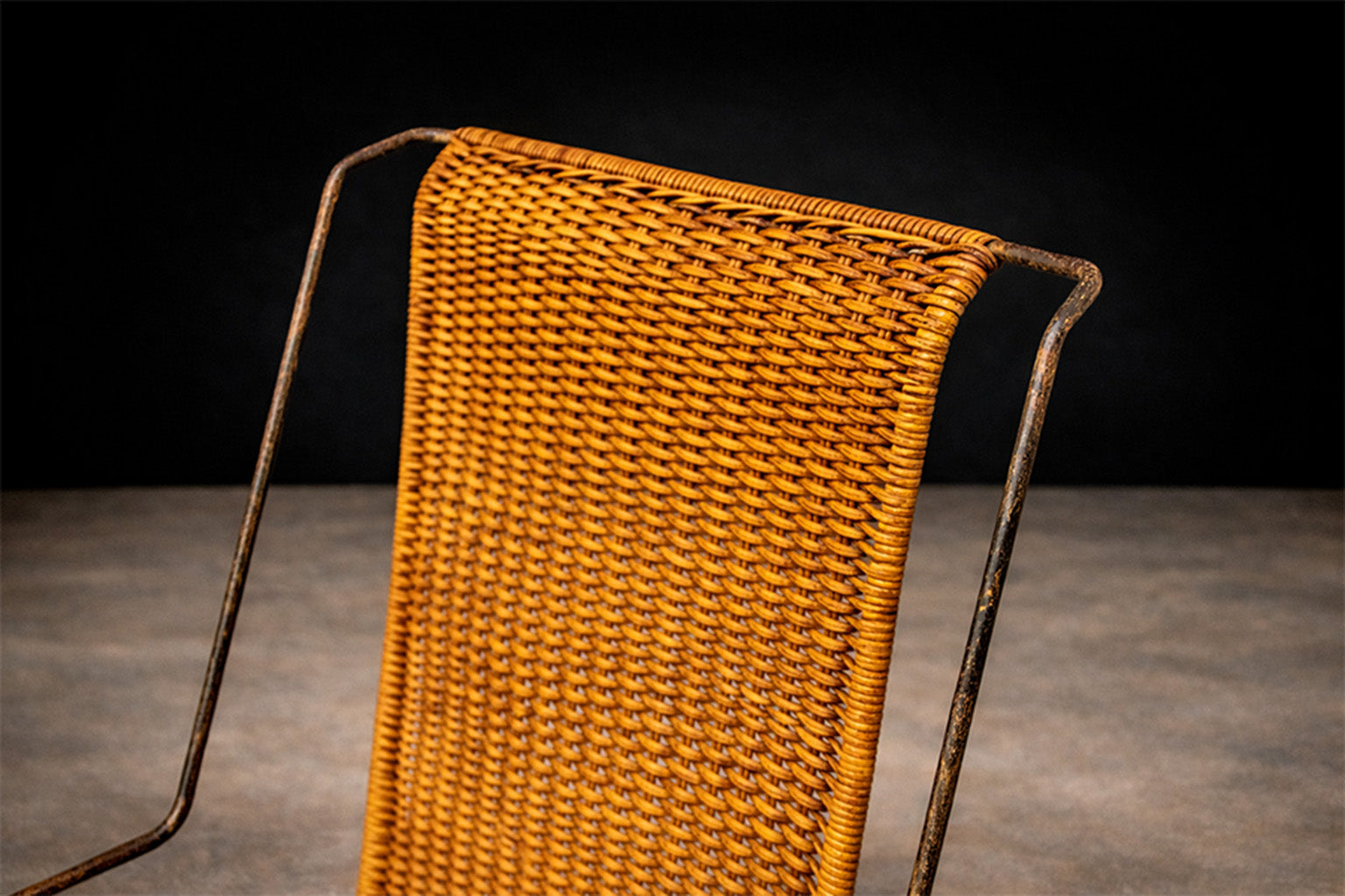 Handwoven cane forms both the seat and tall back panel, creating a suspended plane within the metal structure. The tight, rhythmic weave introduces warmth and texture, while the blackened iron frame provides contrast and definition. The interplay between natural fiber and industrial material reflects the period’s interest in material honesty and climatic responsiveness.