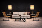 The wicker and steel remain in their original condition, preserving the authentic patina and character of the set. Sculptural yet restrained, these armchairs transition effortlessly between exterior and interior settings, standing as articulate examples of 1950s Brazilian modernism.