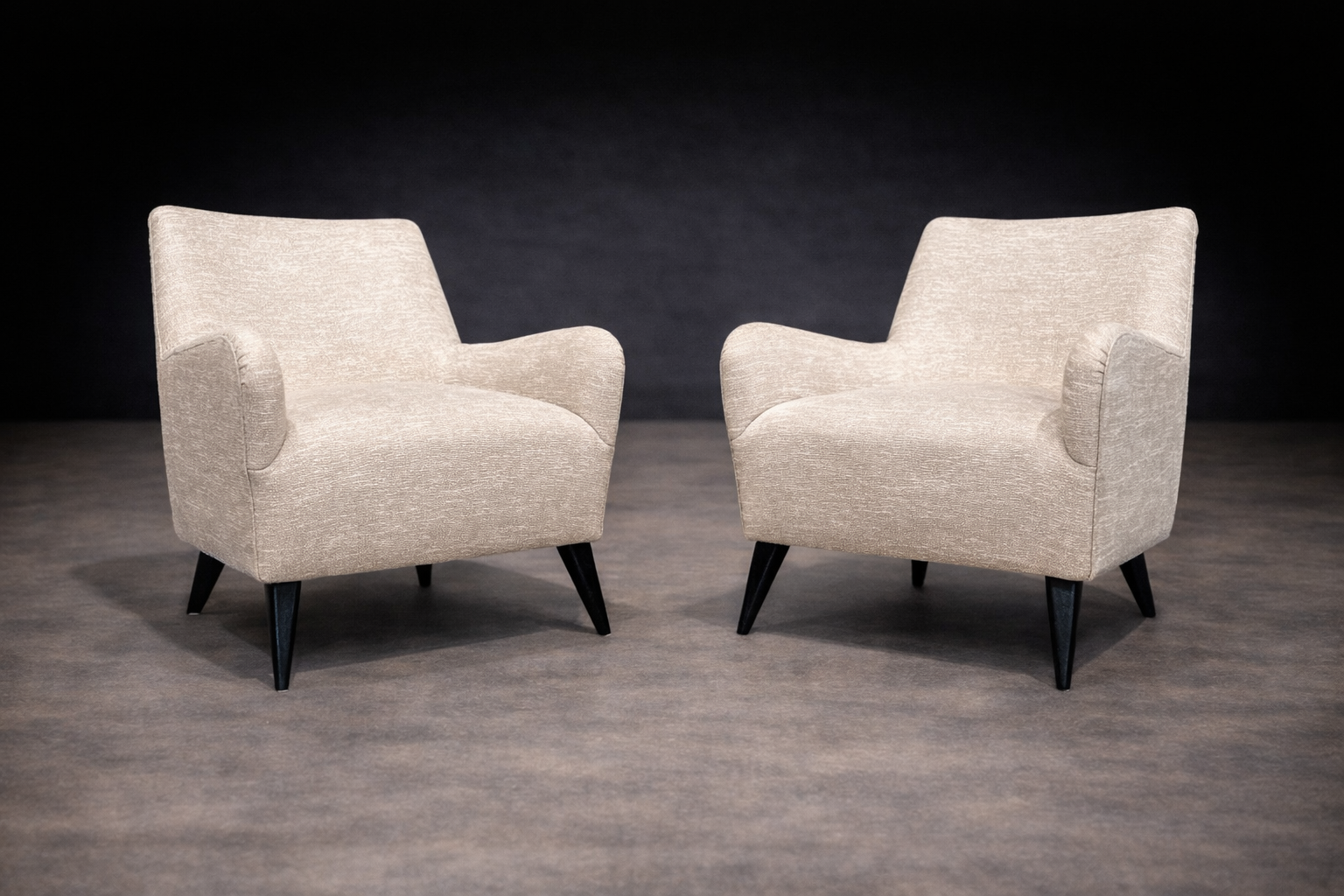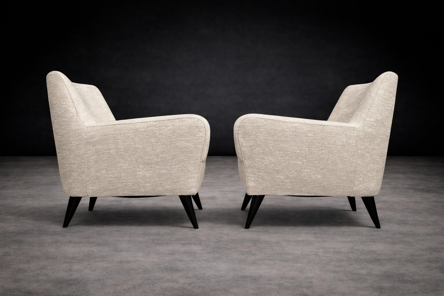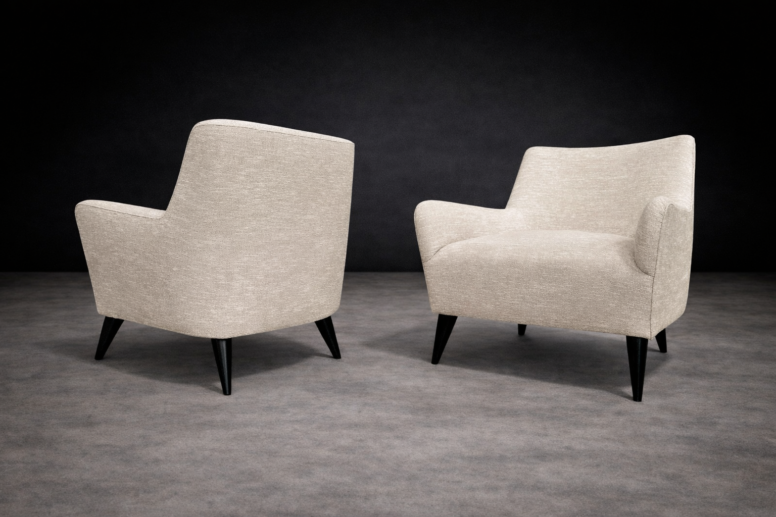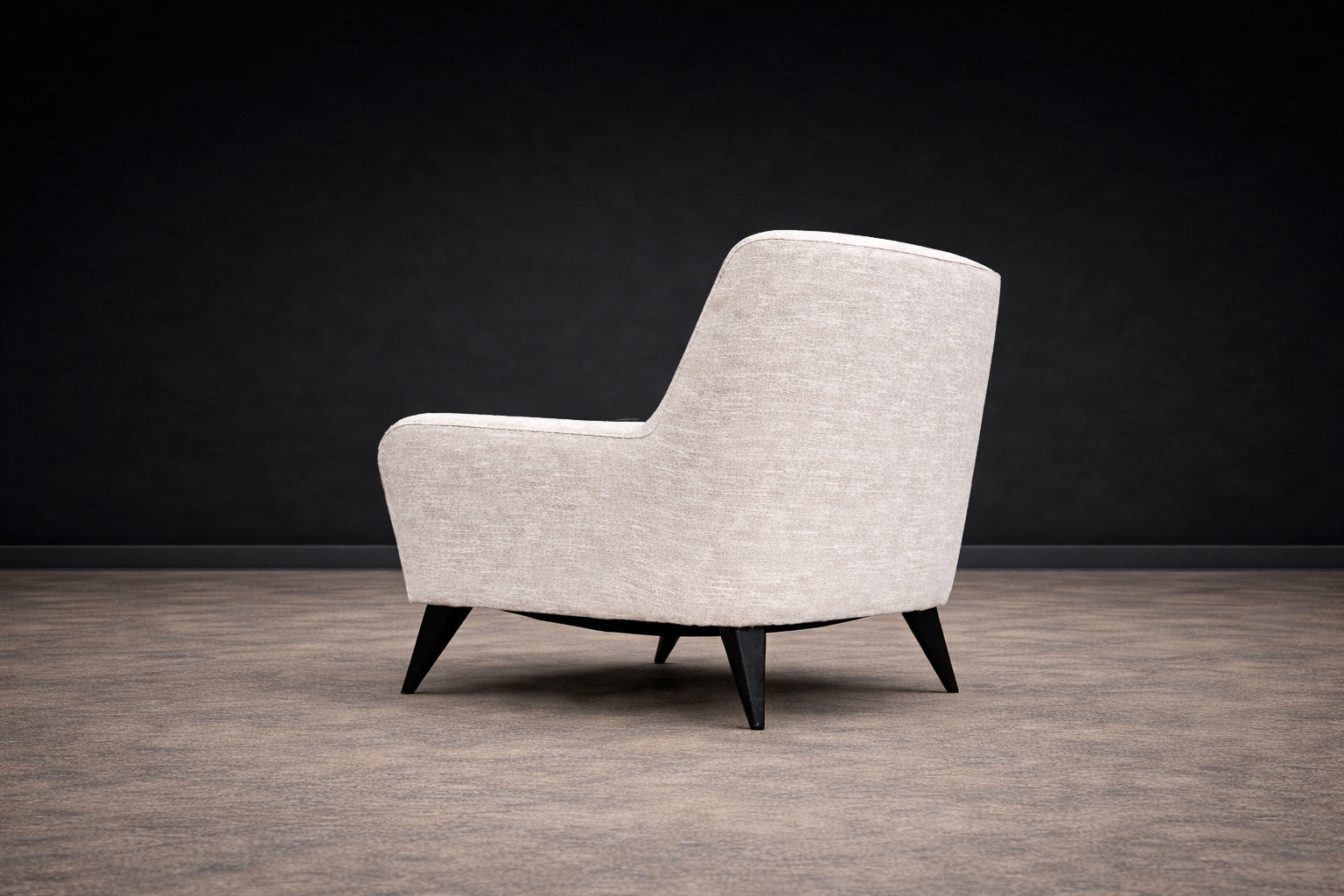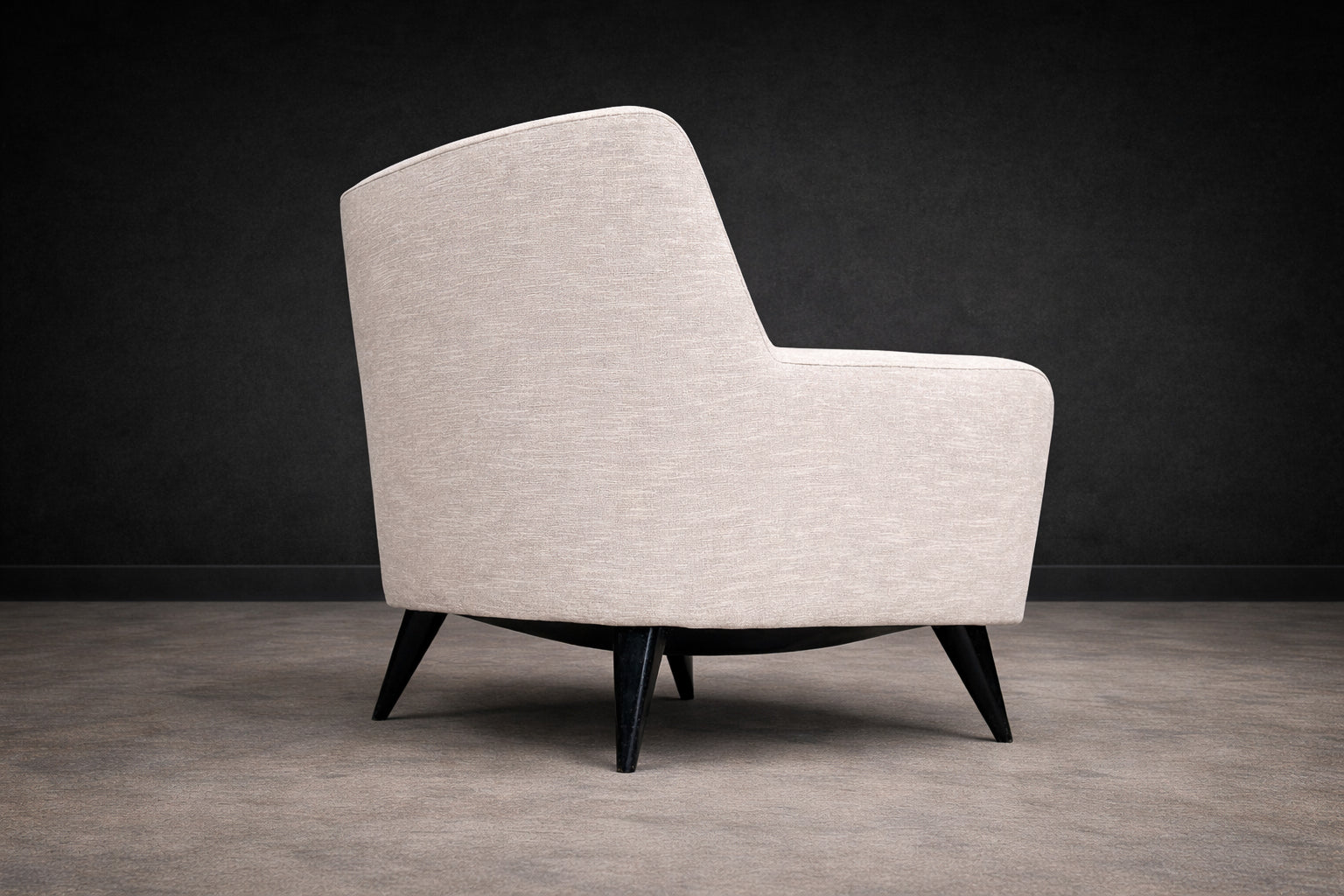 The form is defined by a restrained, architectural silhouette. Gently flared arms and a subtly inclined back articulate comfort through geometry rather than excess. The composition is anchored by tapered, ebonized hardwood legs that introduce contrast and visual lift, reinforcing Tenreiro’s characteristic pursuit of lightness. The volumes remain compact yet generous, with balanced mass and clean transitions between planes.