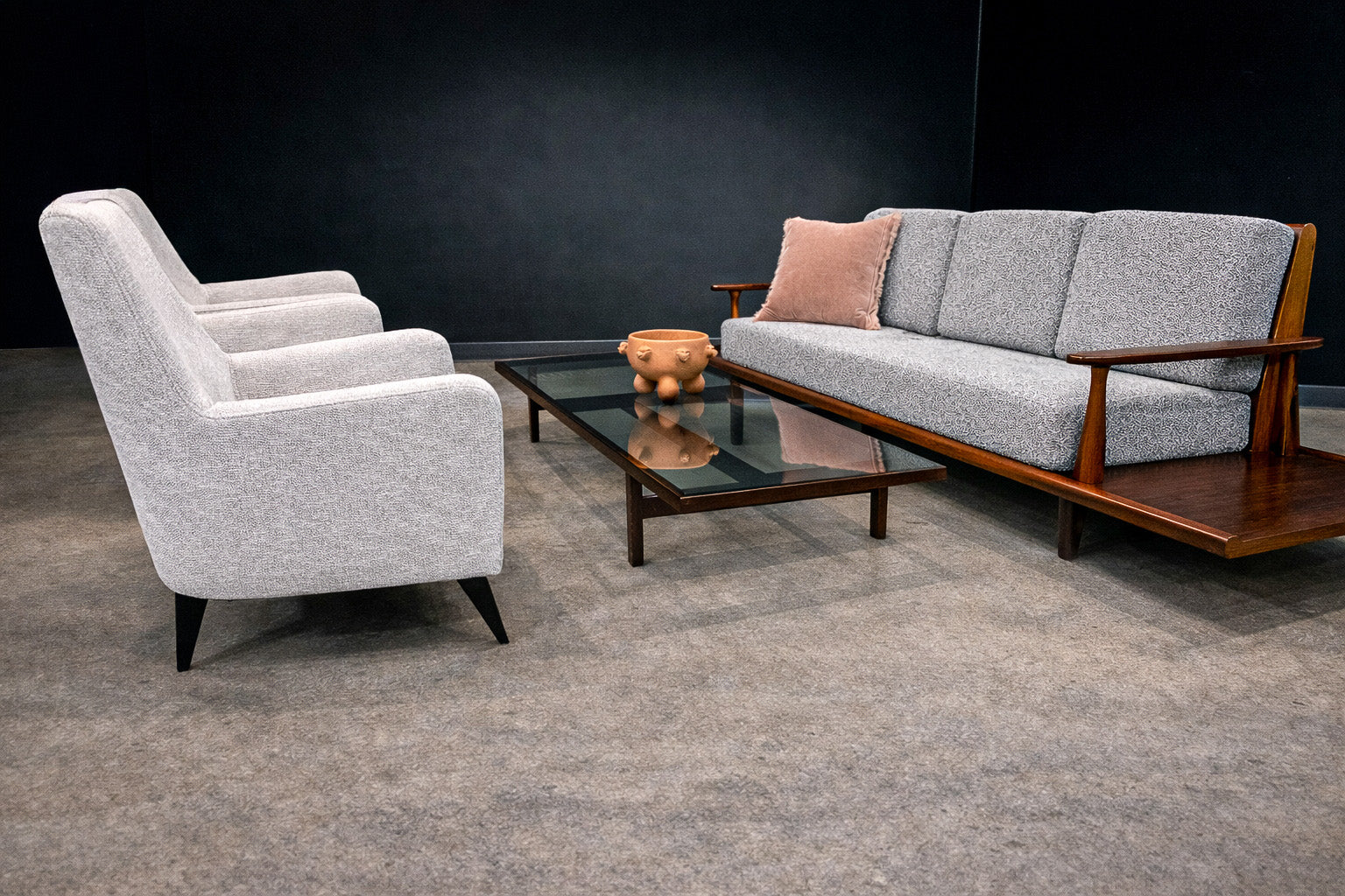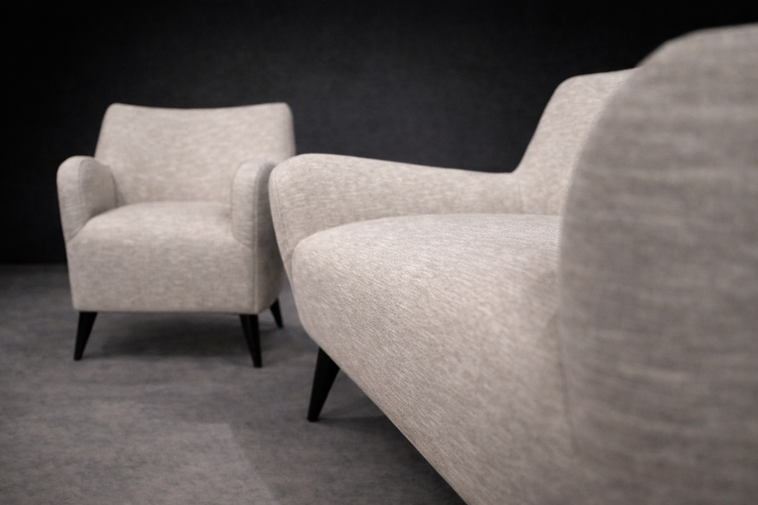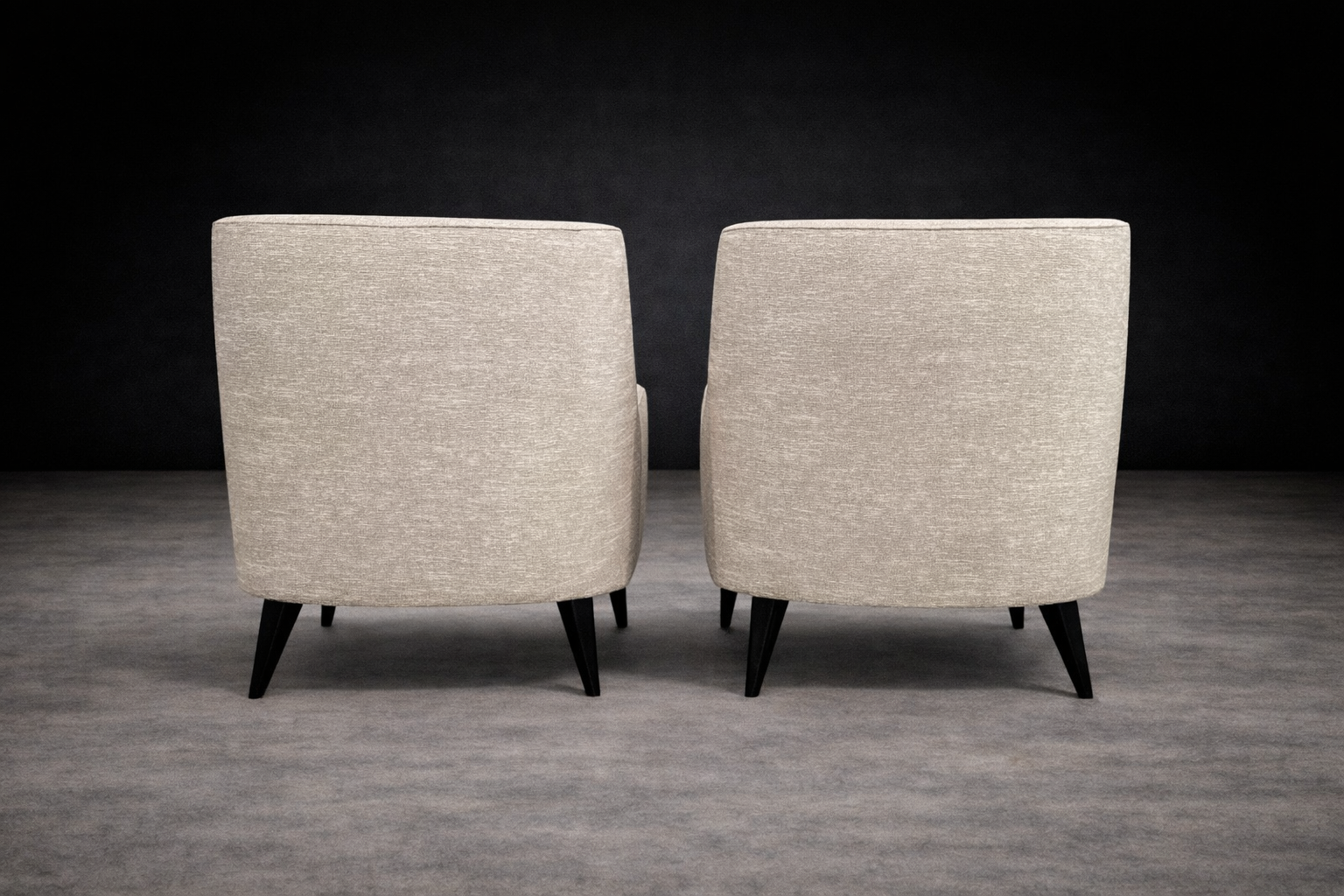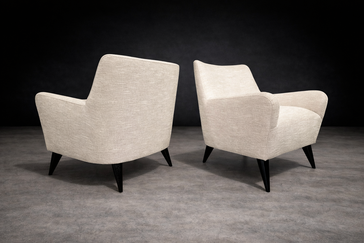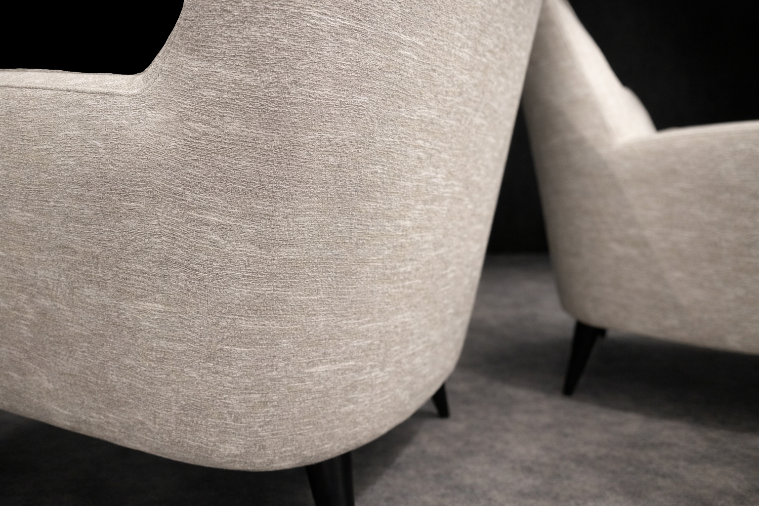 The form is defined by a restrained, architectural silhouette. Gently flared arms and a subtly inclined back articulate comfort through geometry rather than excess. The composition is anchored by tapered, ebonized hardwood legs that introduce contrast and visual lift, reinforcing Tenreiro’s characteristic pursuit of lightness. The volumes remain compact yet generous, with balanced mass and clean transitions between planes.