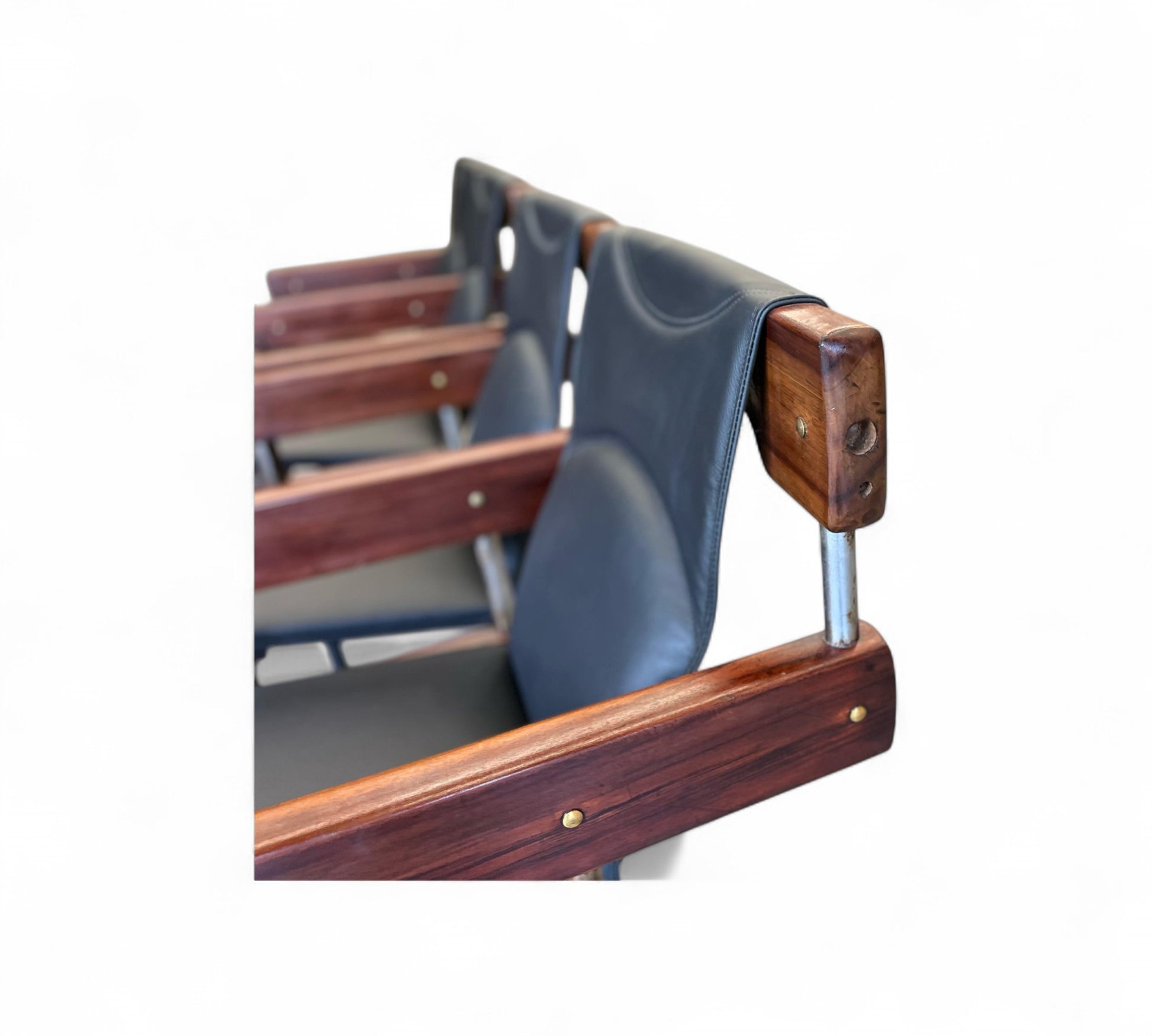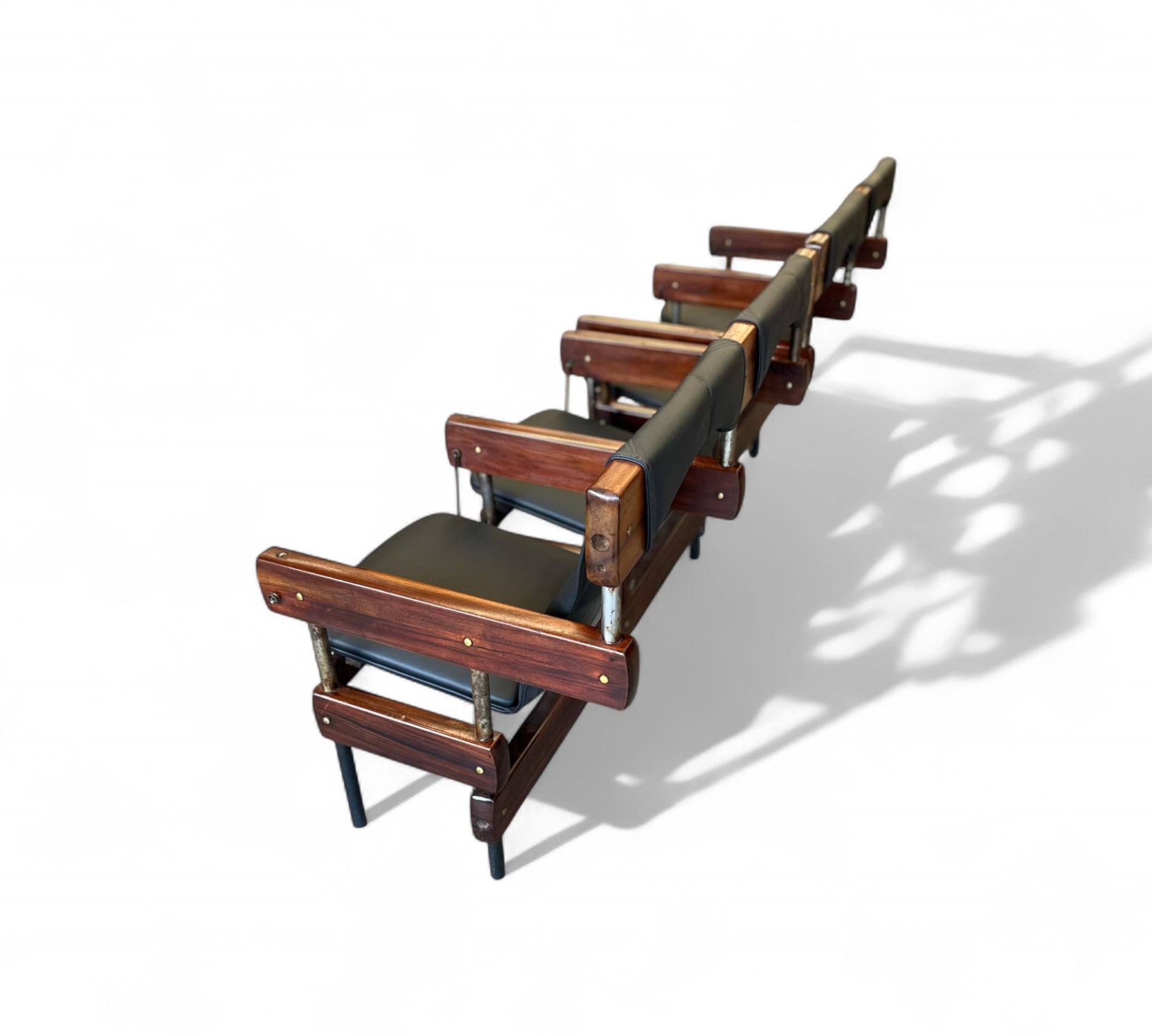This pair of double "Longarina" armchairs was designed for auditoriums, providing a distinctive seating arrangement and optimal comfort. They feature a Brazilian rosewood (jacaranda) and iron frame, with leather seats refinished to excellent condition. These chairs also incorporate a unique built-in mechanism that allows for comfortable reclining without moving the frame. Additionally, the manufacturing seal is visible on the back between the chairs.