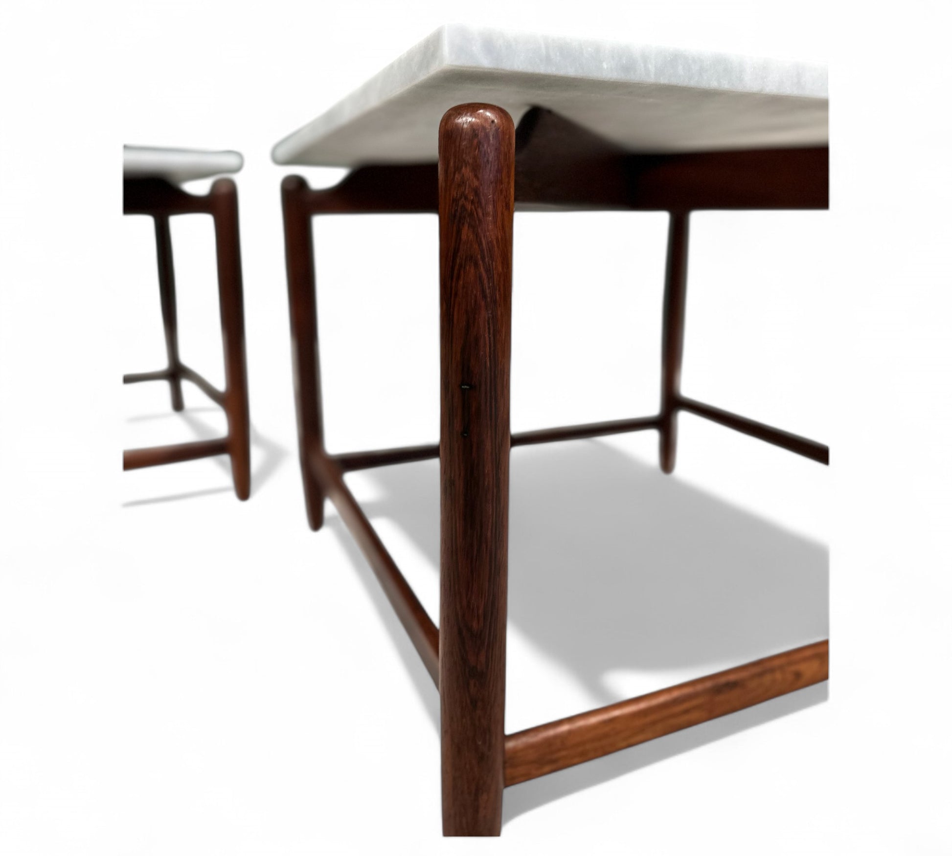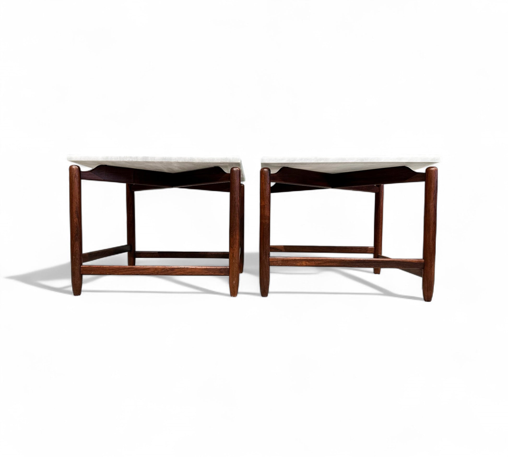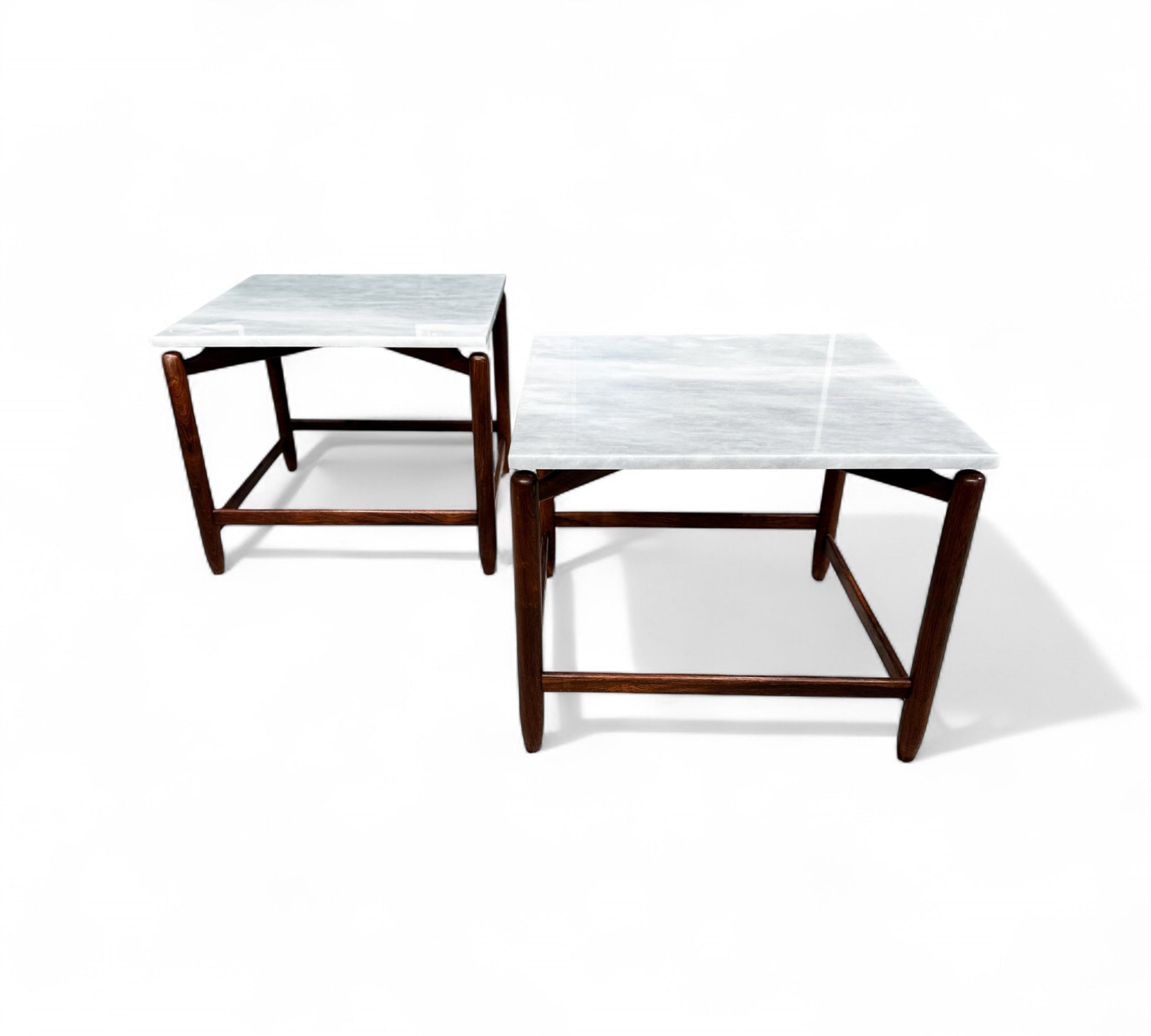 This beautiful pair of side table was made by Jorge Jabour for Moveis Cantu in Brazil in the 1960’s and features a structure entirely made in solid rosewood and a marble top. The four legs and beams have rounded and soft edges. The rosewood has been refinished and displays colorful wood veins. The marble is in excellent condition. This is a set of 2.