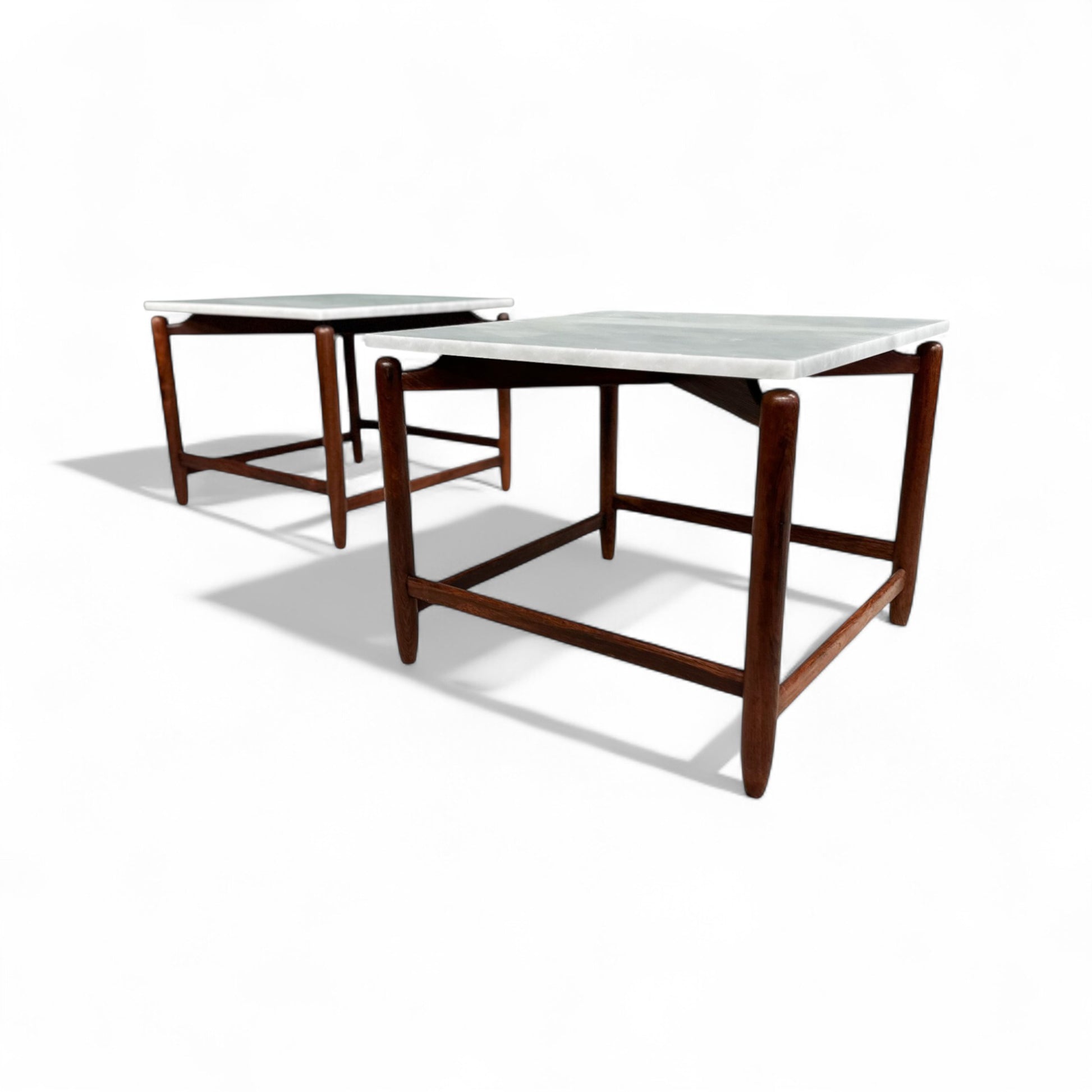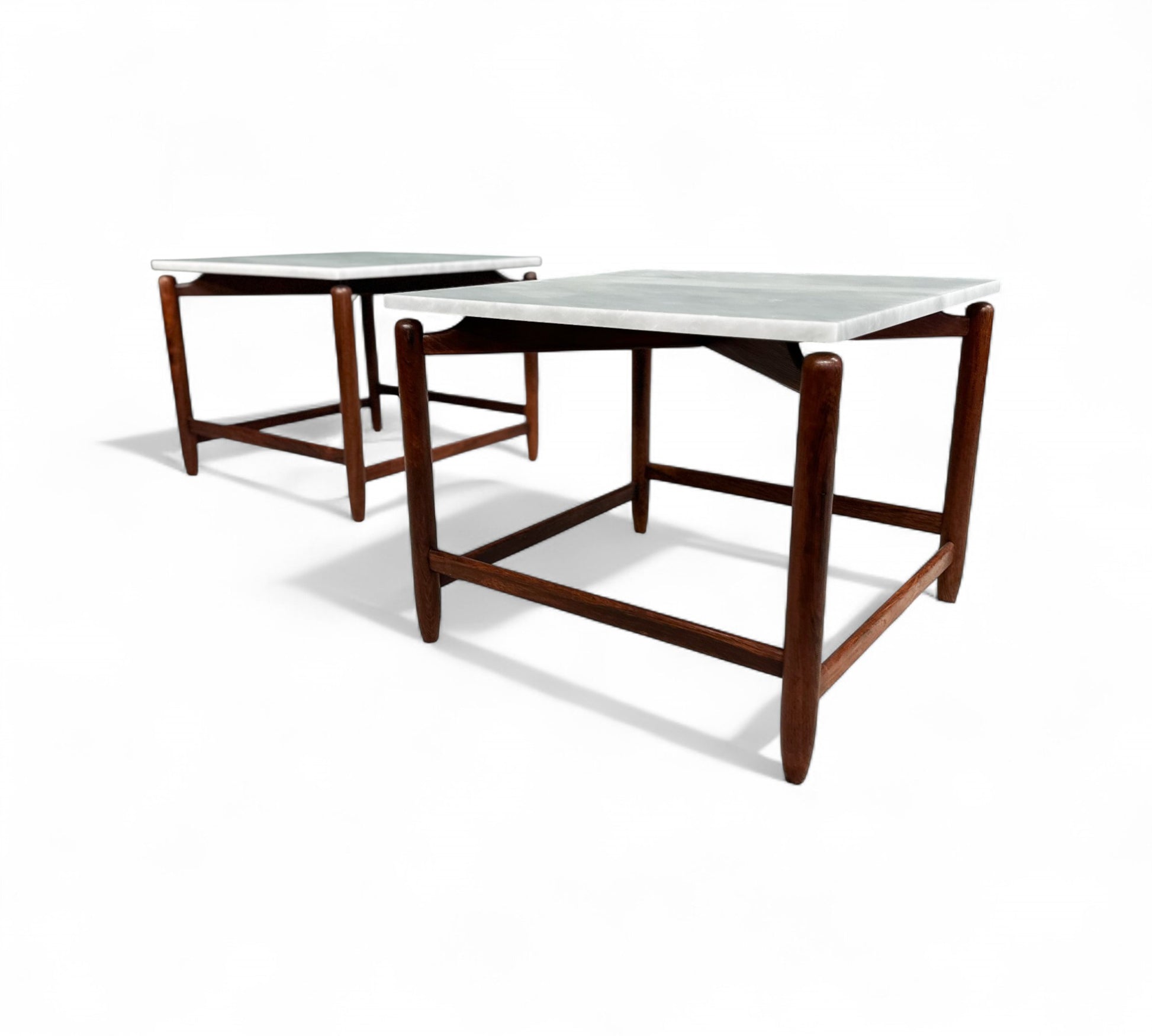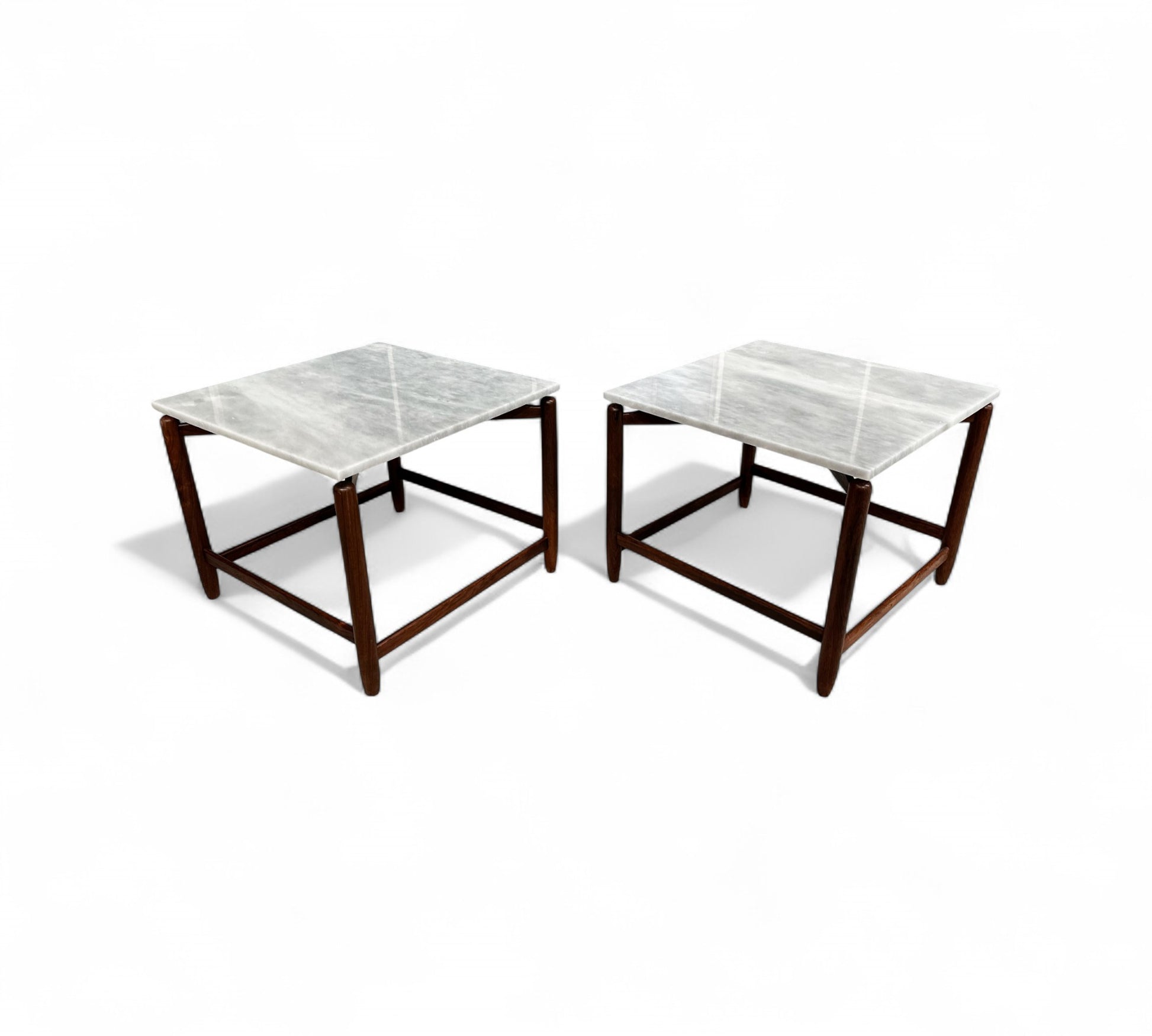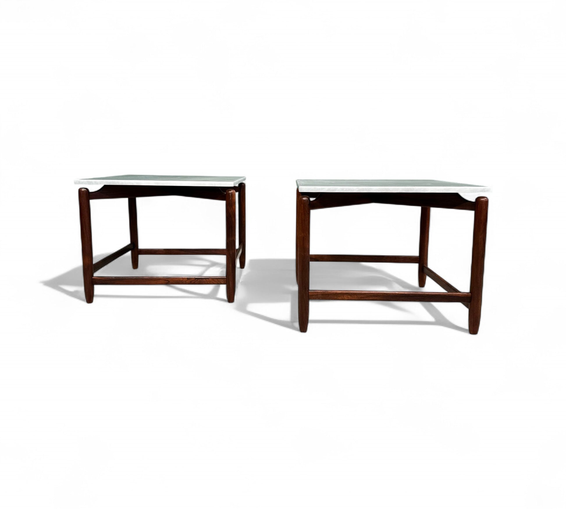 This beautiful pair of side table was made by Jorge Jabour for Moveis Cantu in Brazil in the 1960’s and features a structure entirely made in solid rosewood and a marble top. The four legs and beams have rounded and soft edges. The rosewood has been refinished and displays colorful wood veins. The marble is in excellent condition. This is a set of 2.