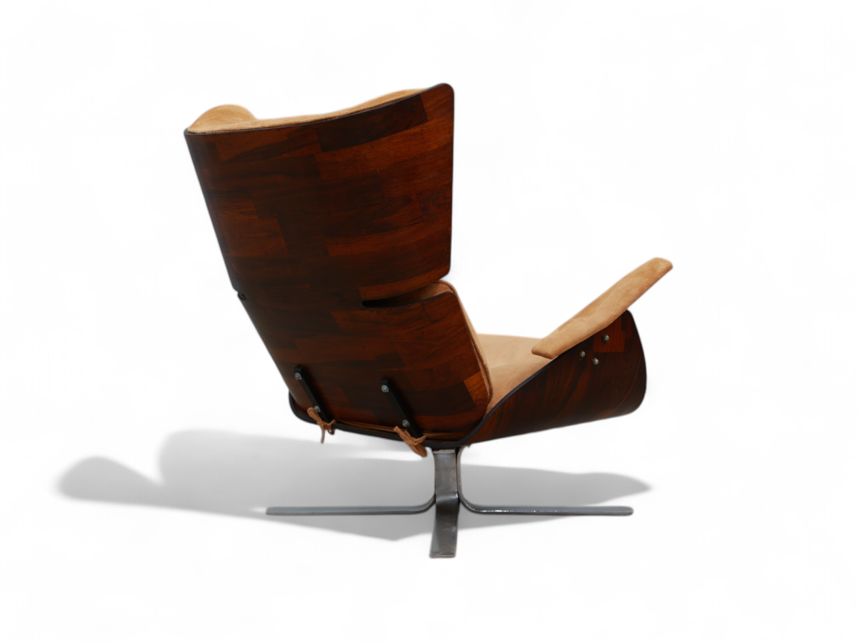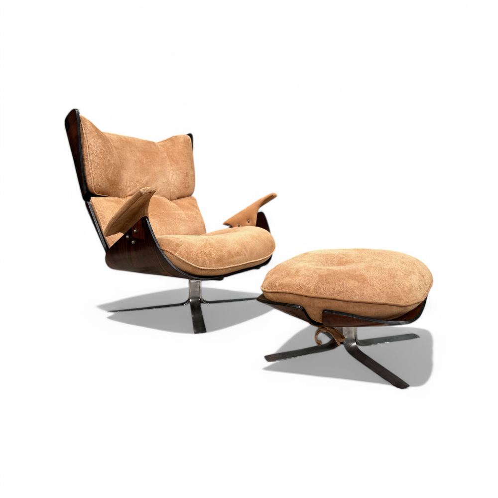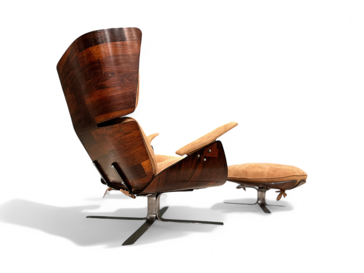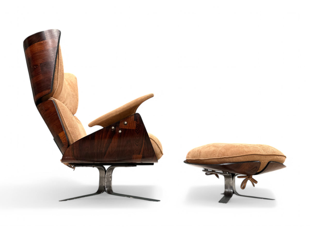 The Paulistana lounge chair and ottoman, designed by Jorge Zalszupin and manufactured by his company L’Atelier in 1959, exemplify mid-century Brazilian sophistication. Zalszupin pioneered the use of plywood in crafting the lounge chair, naming it after São Paulo's citizens, known as “Paulistanos.” This design features molded Brazilian rosewood (Jacaranda), suede upholstery, and a metal base.