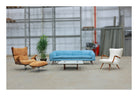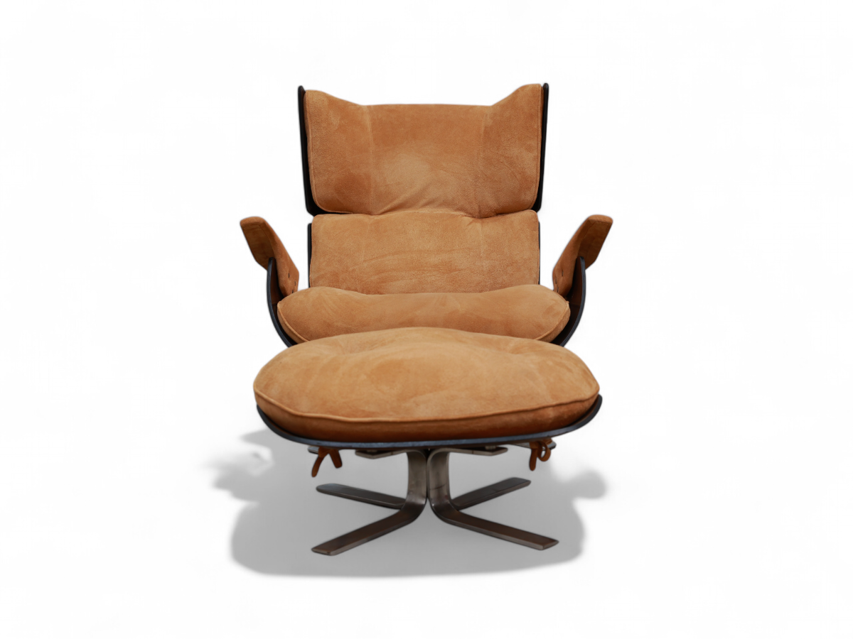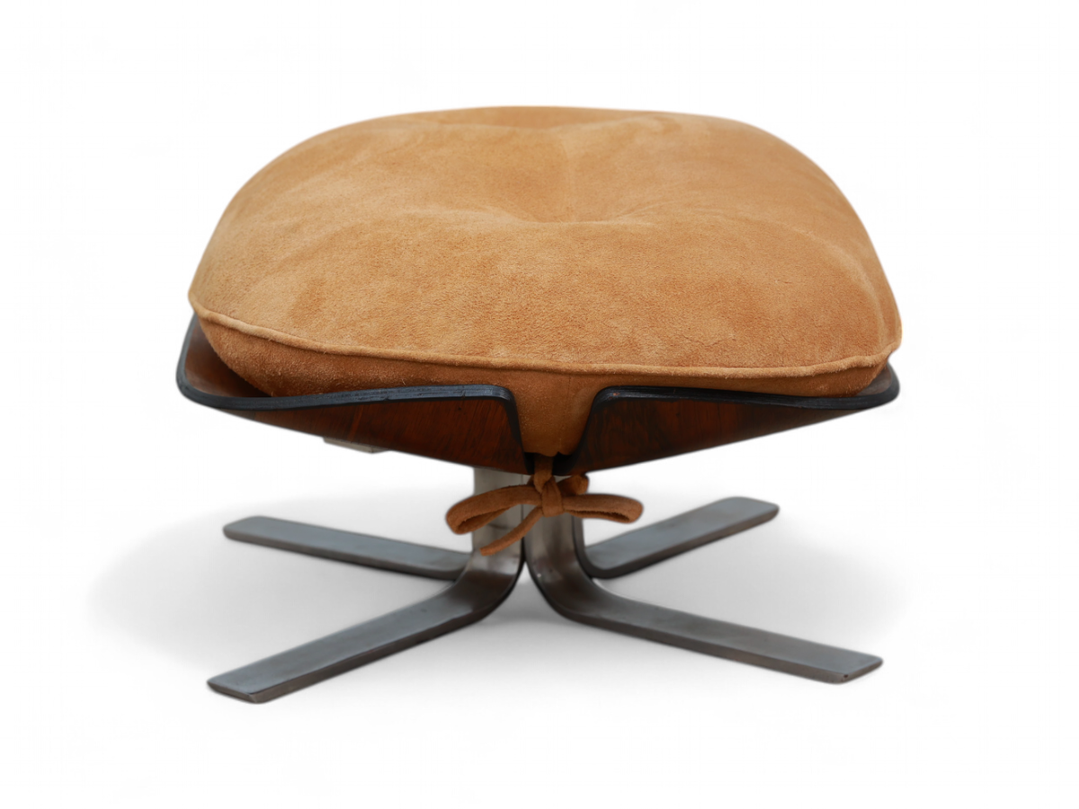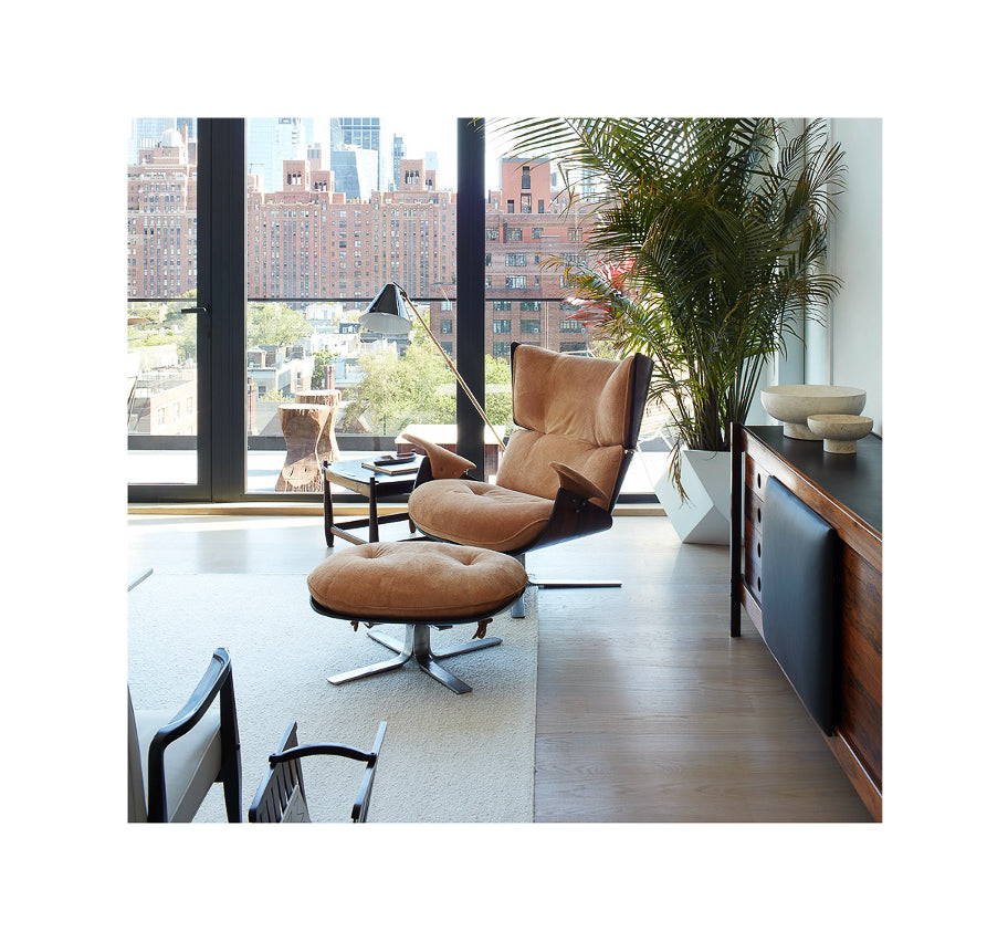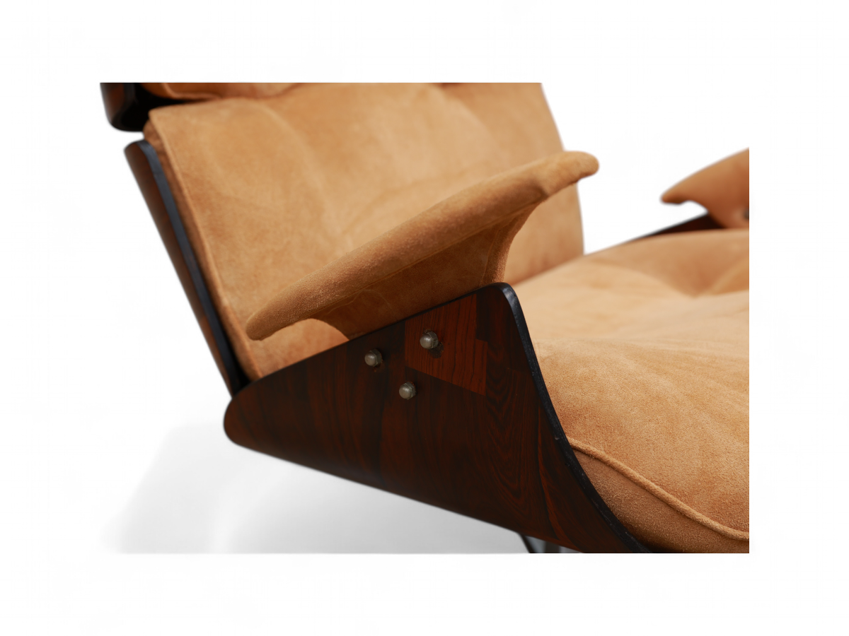 The Paulistana lounge chair and ottoman, designed by Jorge Zalszupin and manufactured by his company L’Atelier in 1959, exemplify mid-century Brazilian sophistication. Zalszupin pioneered the use of plywood in crafting the lounge chair, naming it after São Paulo's citizens, known as “Paulistanos.” This design features molded Brazilian rosewood (Jacaranda), suede upholstery, and a metal base.