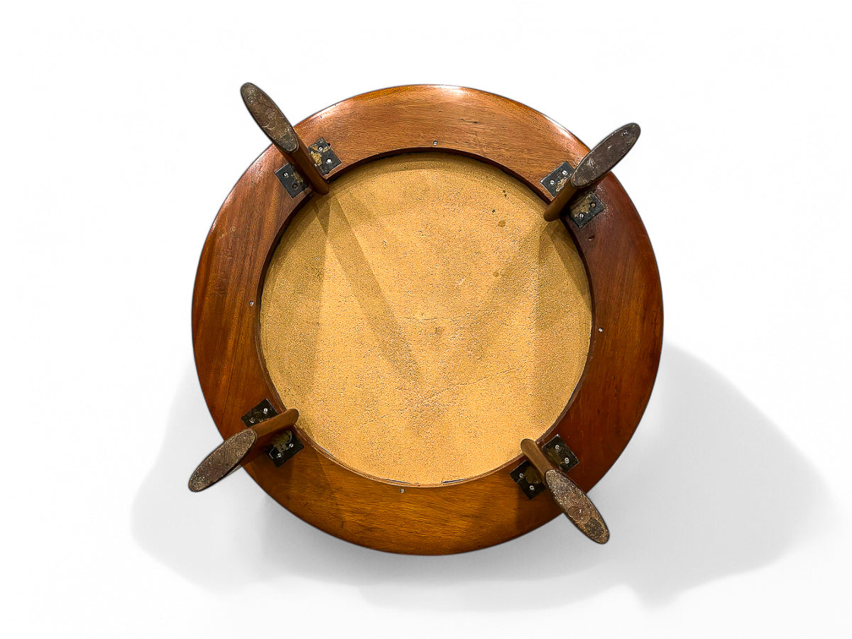 This round coffee table is crafted from hardwood and topped with black leather. It features a circular tabletop supported by four delicate curved legs. The wood has been refinished to enhance its appearance, while the leather top has been reconditioned, ensuring the piece is in excellent condition.