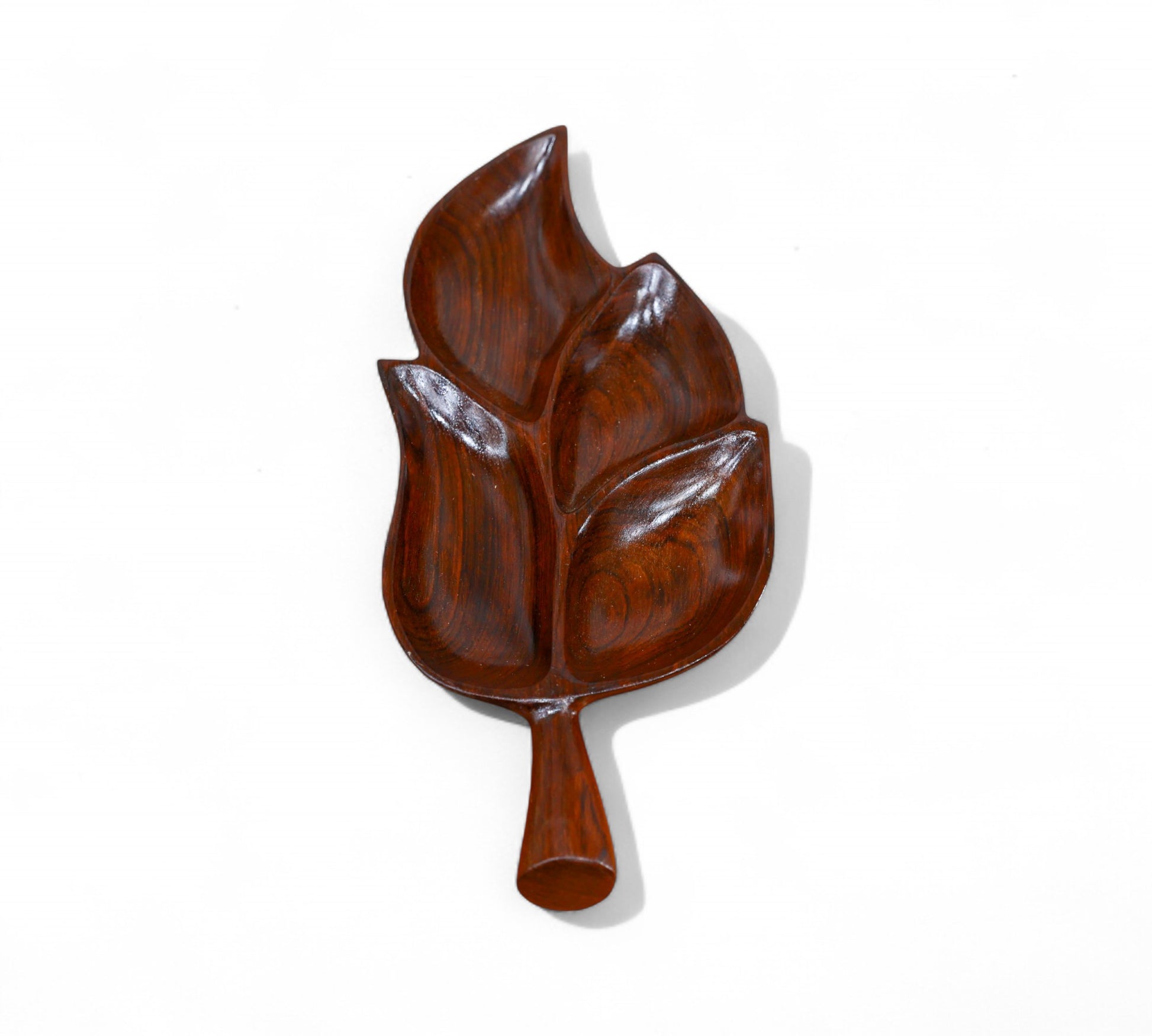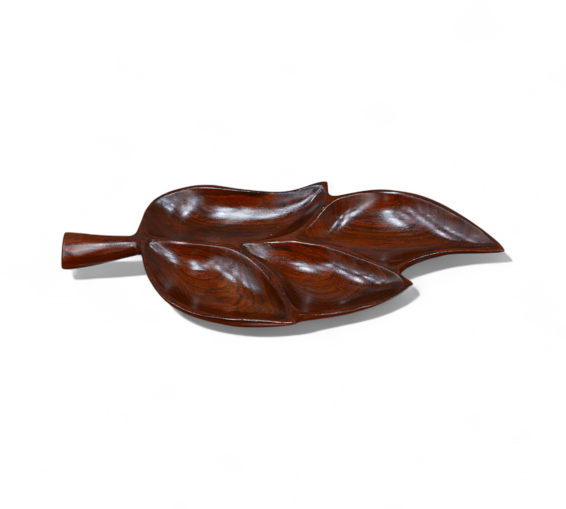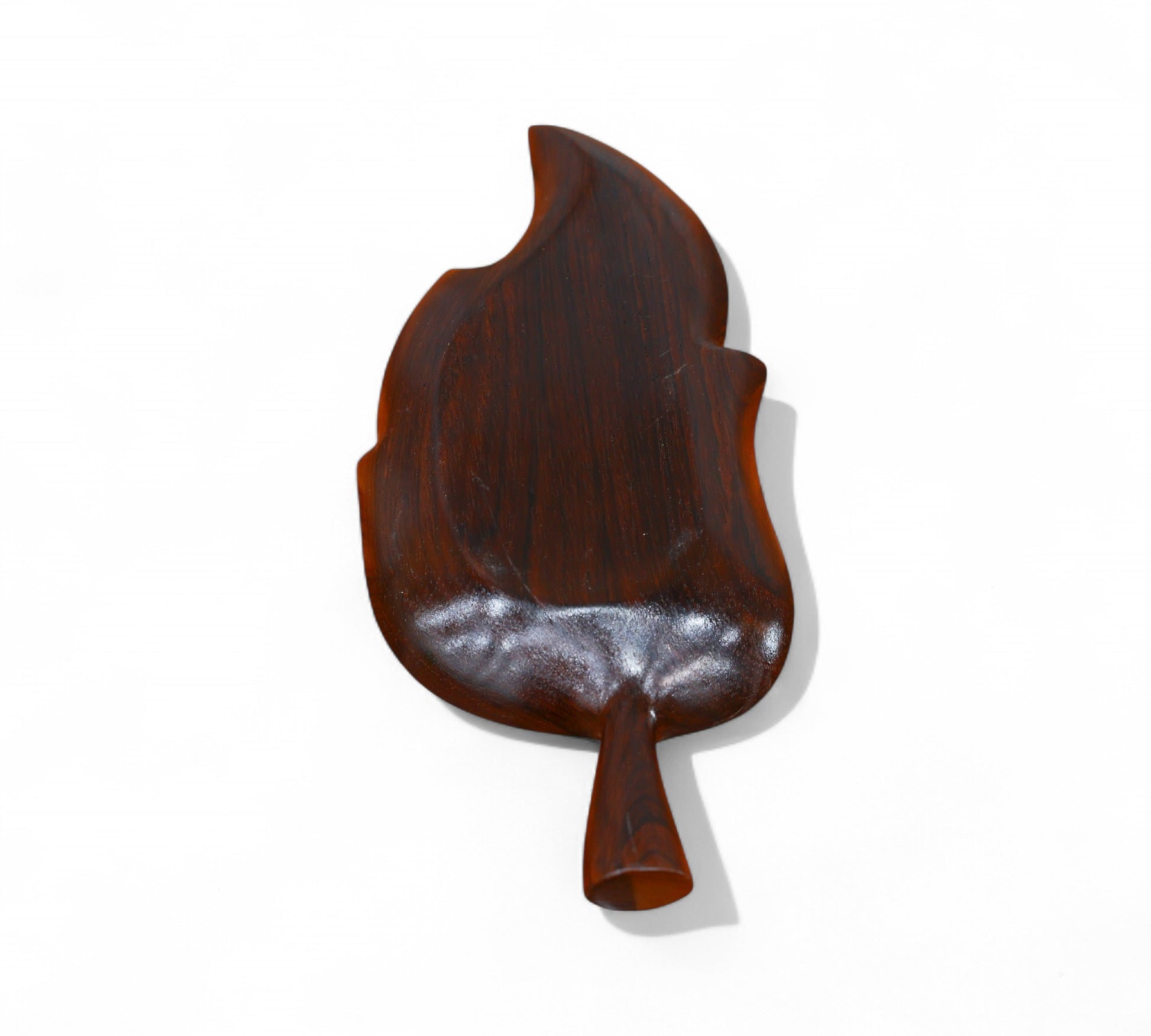Handcrafted from noble wood, the serving platter features smooth curves and delicate woodwork emulating a tropical leaf from the Amazon. The noblewood has rich tones with stunning natural wood grain on both sides. Pieces like this are iconic from Brazil in the sixties, and were catered not only for domestic but for the international markets. The wood has been refinished. Besides minor marks of age the piece is in excellent condition.