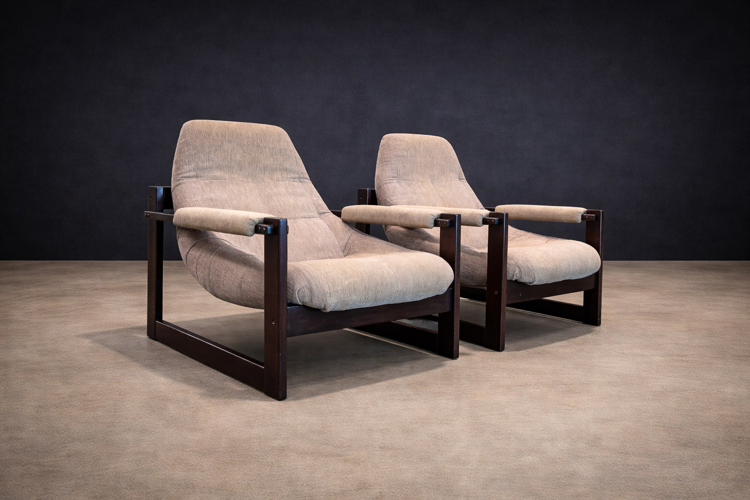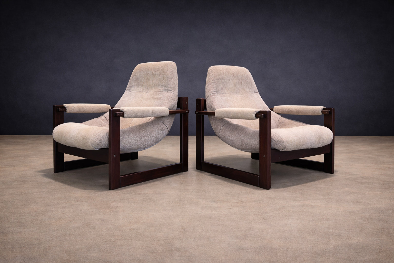 Designed in 1976 by Percival Lafer for Lafer MP, this rare set of two “S-1” armchairs reflects a pivotal moment in Brazilian design, where comfort-driven innovation met refined modernist structure. The model is distinguished by its low, architectural profile and generously proportioned molded foam sling seats, conceived to provide ergonomic support without sacrificing visual clarity.