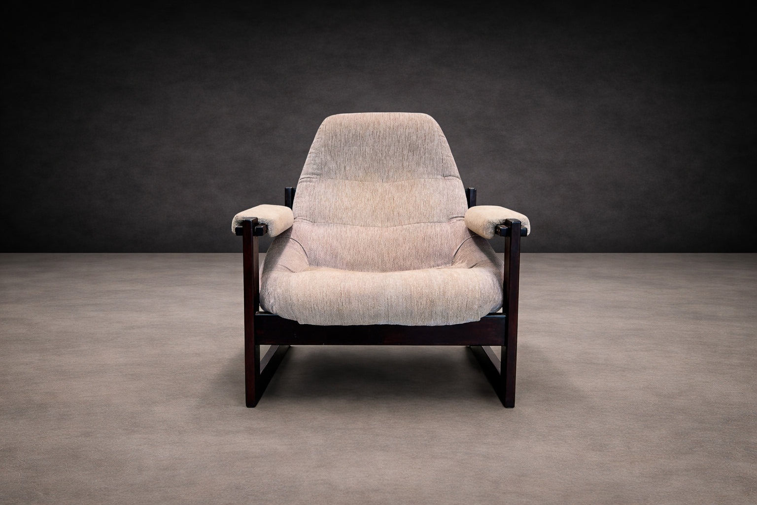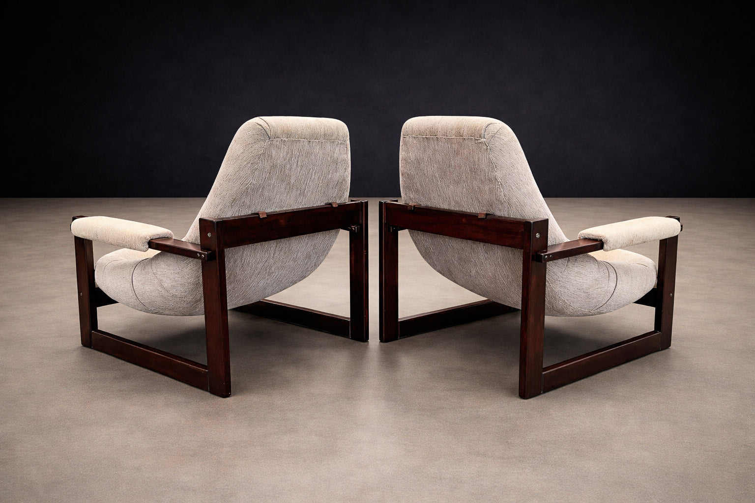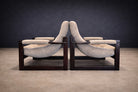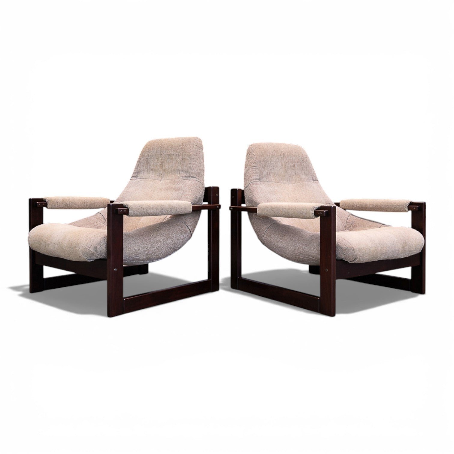 Each chair is anchored by a beautifully refinished jatobá hardwood frame, whose deep tone and dense grain lend both structural strength and sculptural presence. The exposed joinery and rectilinear geometry introduce a subtle Scandinavian sensibility, balanced by the relaxed posture and tactile softness of the upholstery. Retaining their original fabric, the seats present in very good condition, preserving the integrity and authenticity of the design.