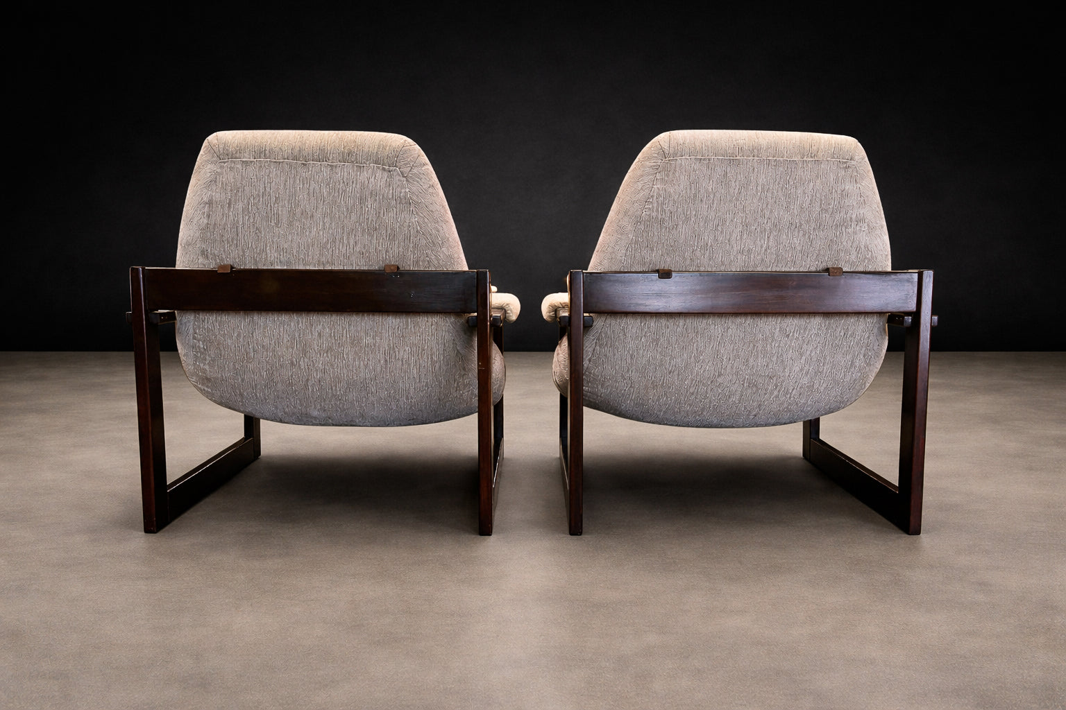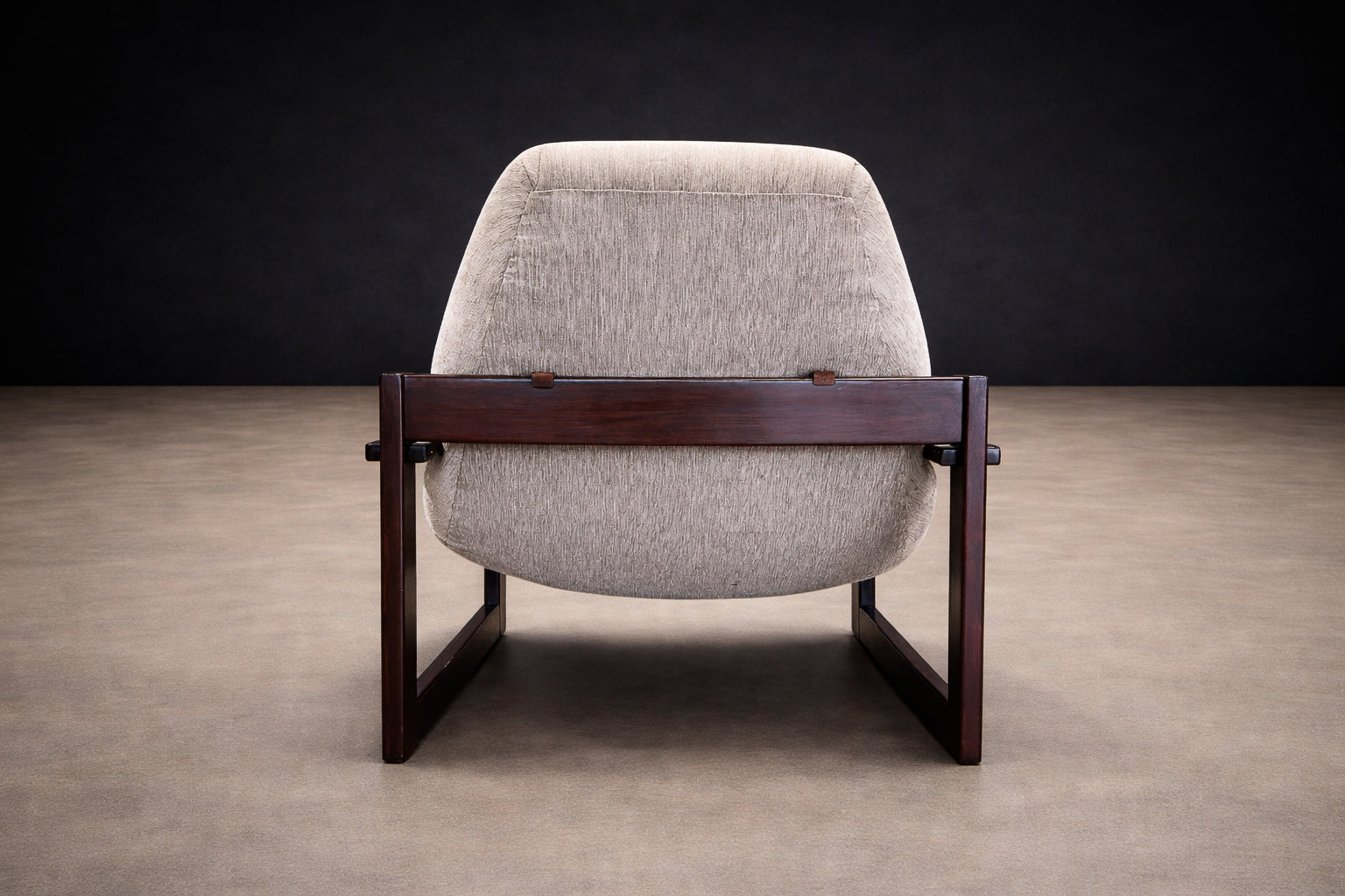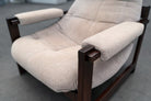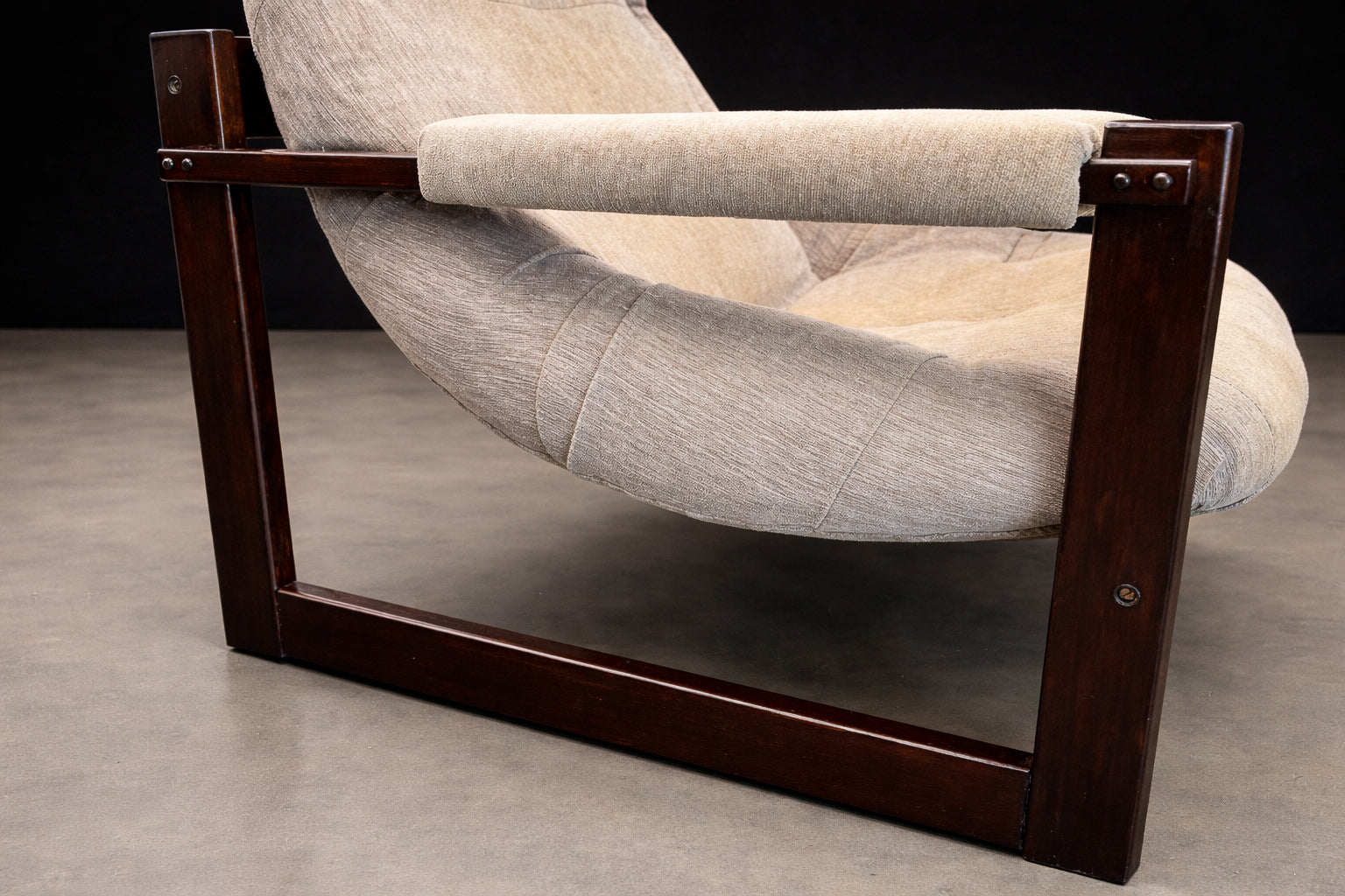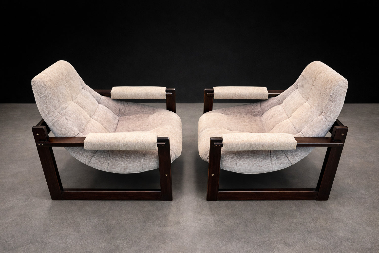 Each chair is anchored by a beautifully refinished jatobá hardwood frame, whose deep tone and dense grain lend both structural strength and sculptural presence. The exposed joinery and rectilinear geometry introduce a subtle Scandinavian sensibility, balanced by the relaxed posture and tactile softness of the upholstery. Retaining their original fabric, the seats present in very good condition, preserving the integrity and authenticity of the design.