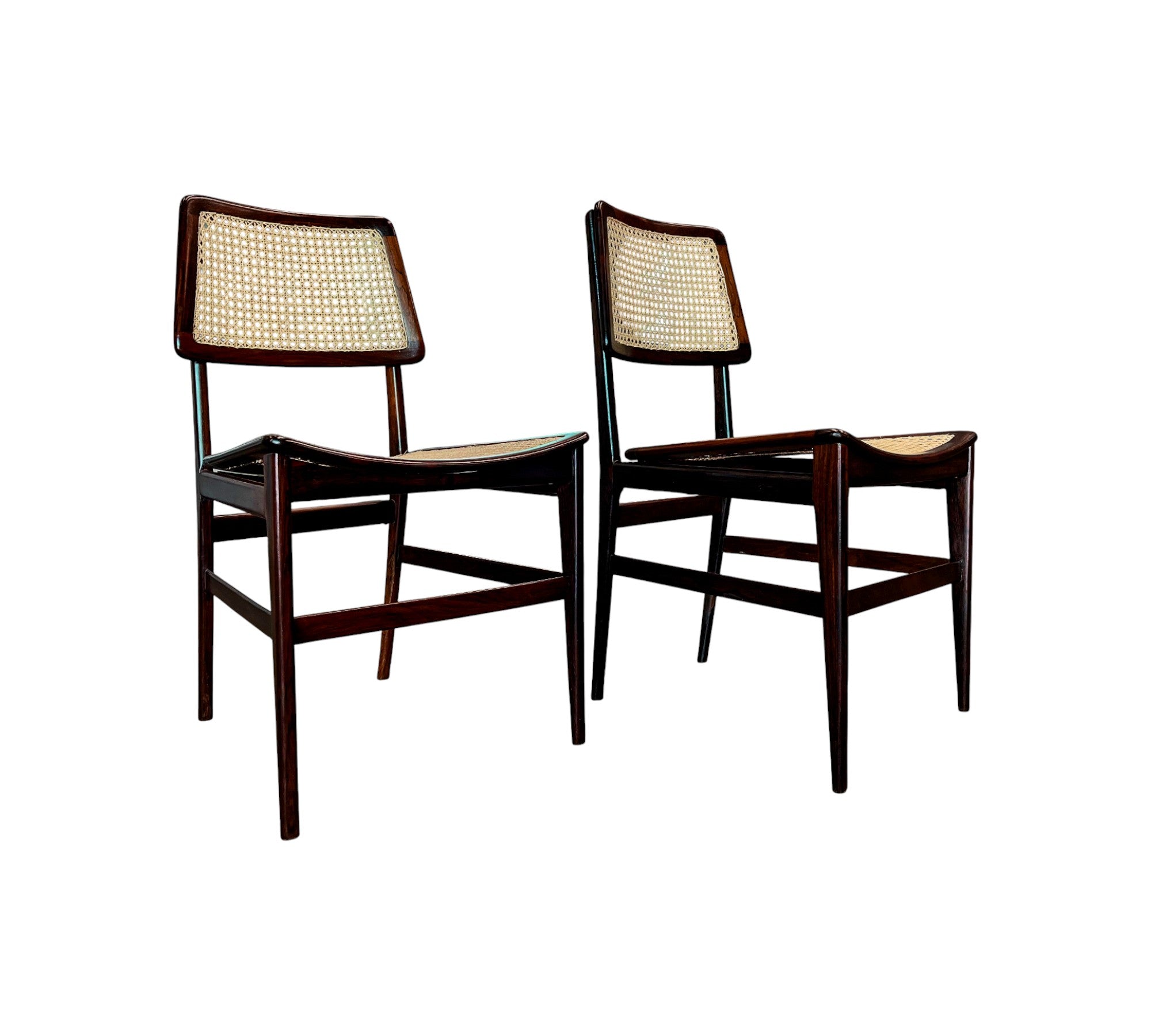 This stunning set of 2 chairs in Brazilian Rosewood, known as Jacaranda, and caning were designed by Joaquim Tenreiro in the 1960’s. The “Chair with Curved Seat" (or “Cadeira com Assento Curvo” in Portuguese) is featured in Joaquim Tenreiro’s book (image attached). Tenreiro successfully merges simplicity and lightness with Brazilian materials - cane and Jacaranda. This model was replicated by Celina Decoracoes and Forma Moveis but none of them executed it with Tenreiro’s wood mastery. This can be seen throughout the piece in the joints, the curved seat, and the legs. This model is one of Tenreiro’s staples and owning this pair of chairs will not only be useful and a showstopper but a great investment that will continue to appreciate in value with time.