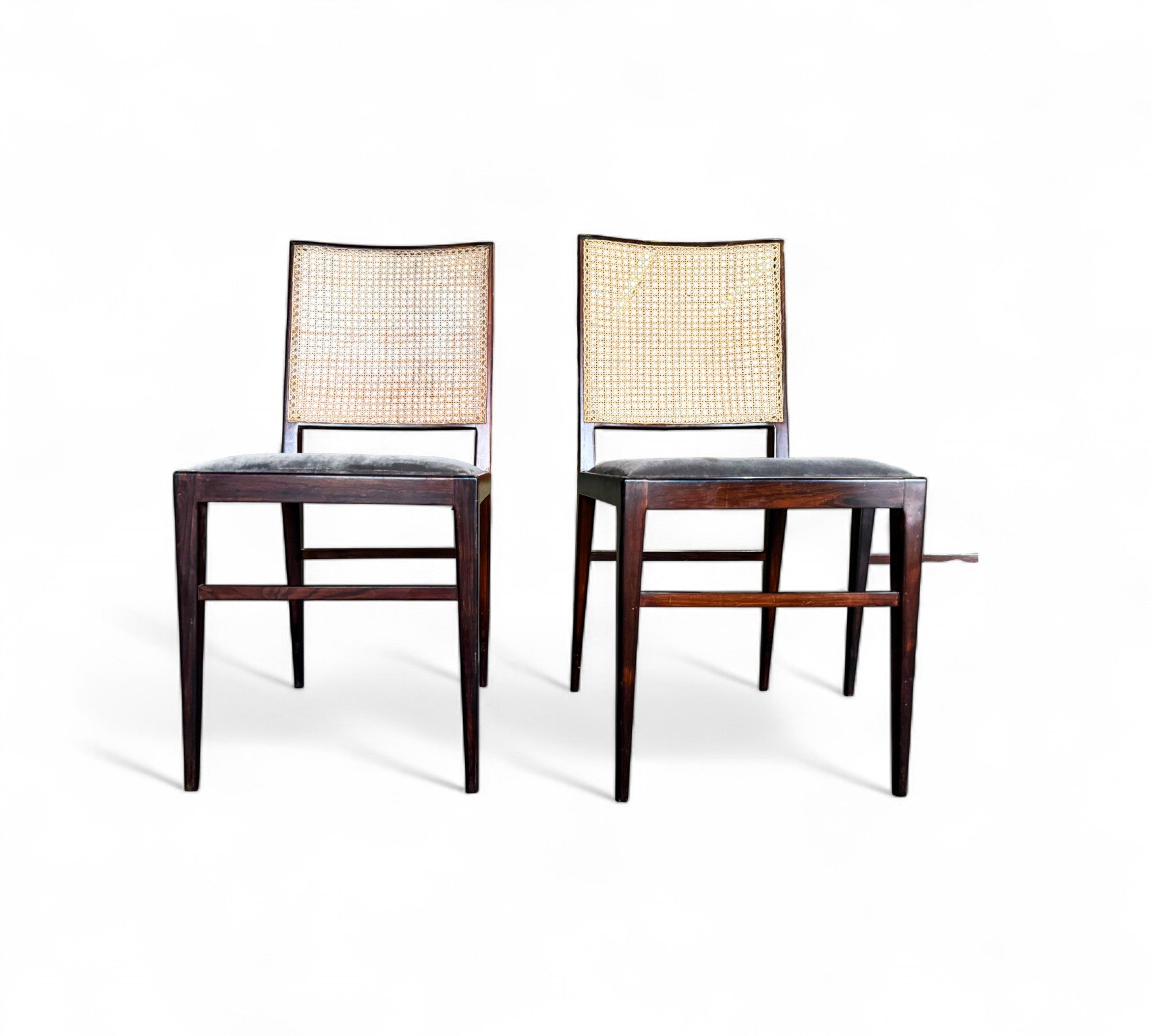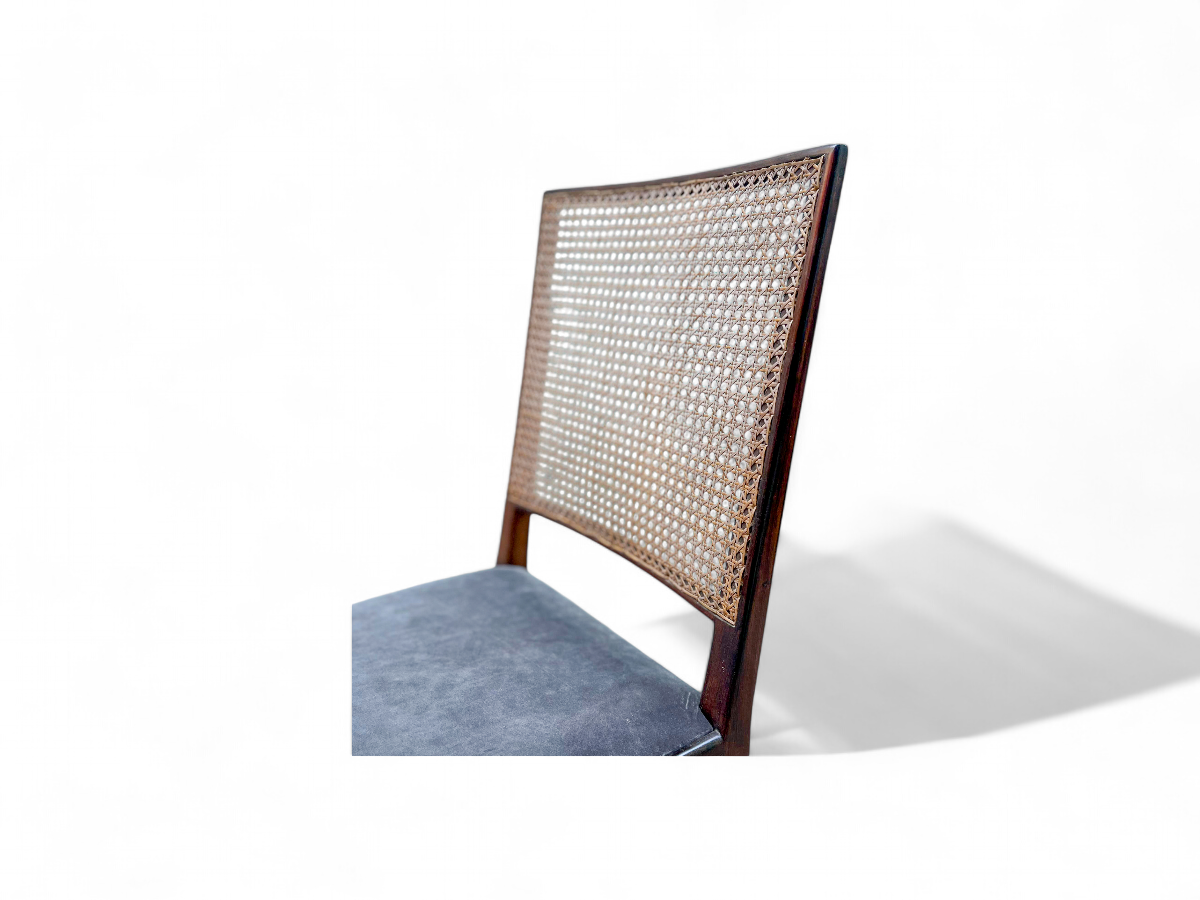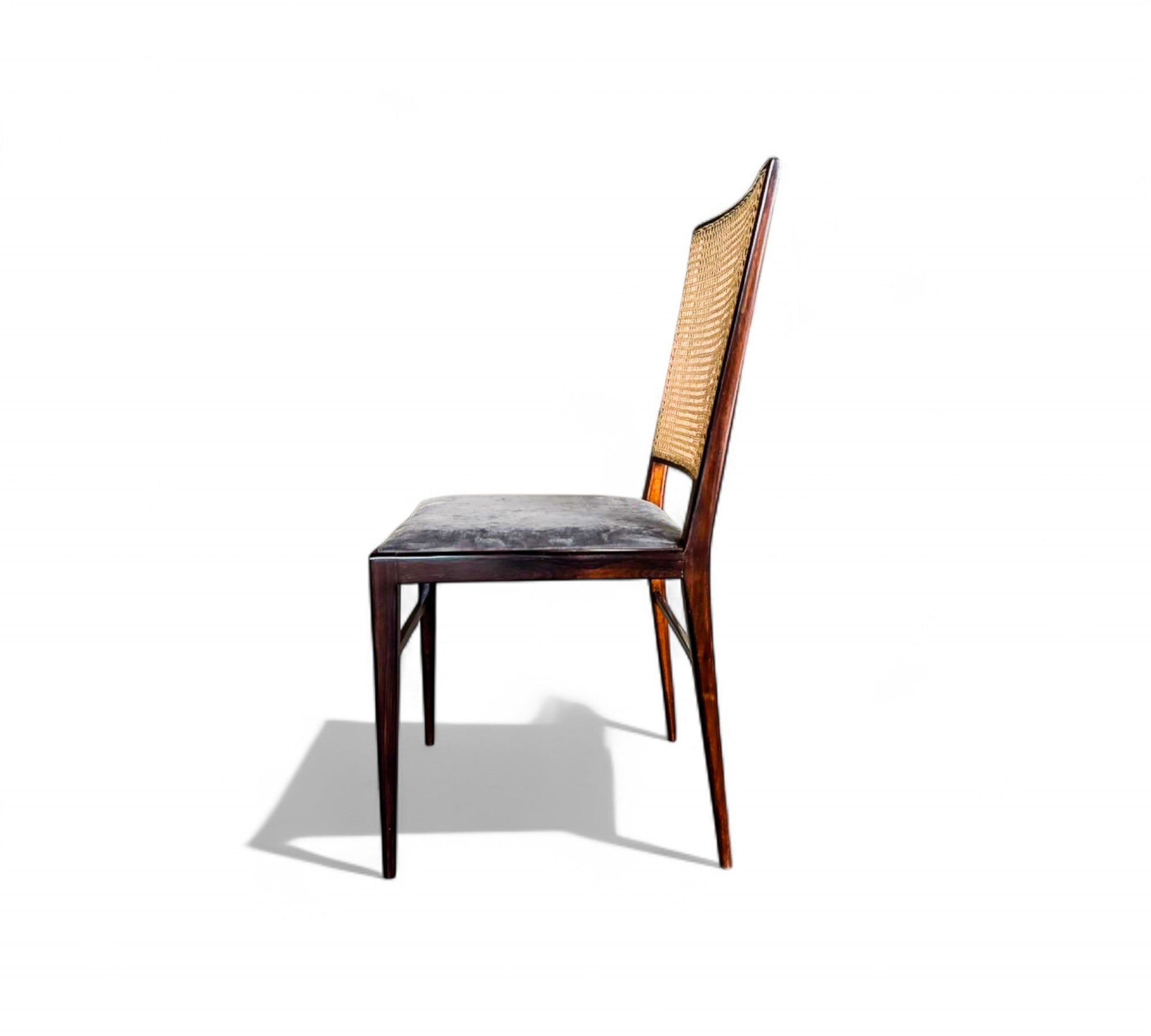 Each dining chair features a structure in Brazilian rosewood with four delicate long legs with the backrest in caning and the seat in its original ultra suede upholstery. The wood has been refinished and displays colorful veins that make the chair look almost alive. The caning is new for two chairs and original for the other two. This set perfectly represents the Brazilian Modernist movement in the sixties: straight lines, leather, and abundance in the use of hardwood.