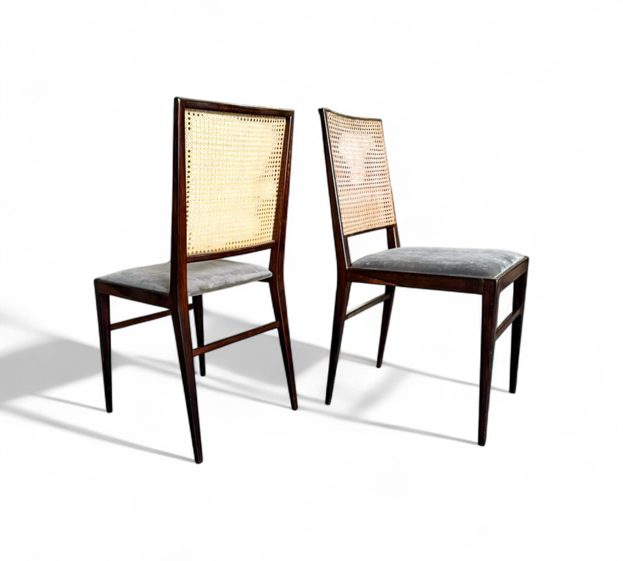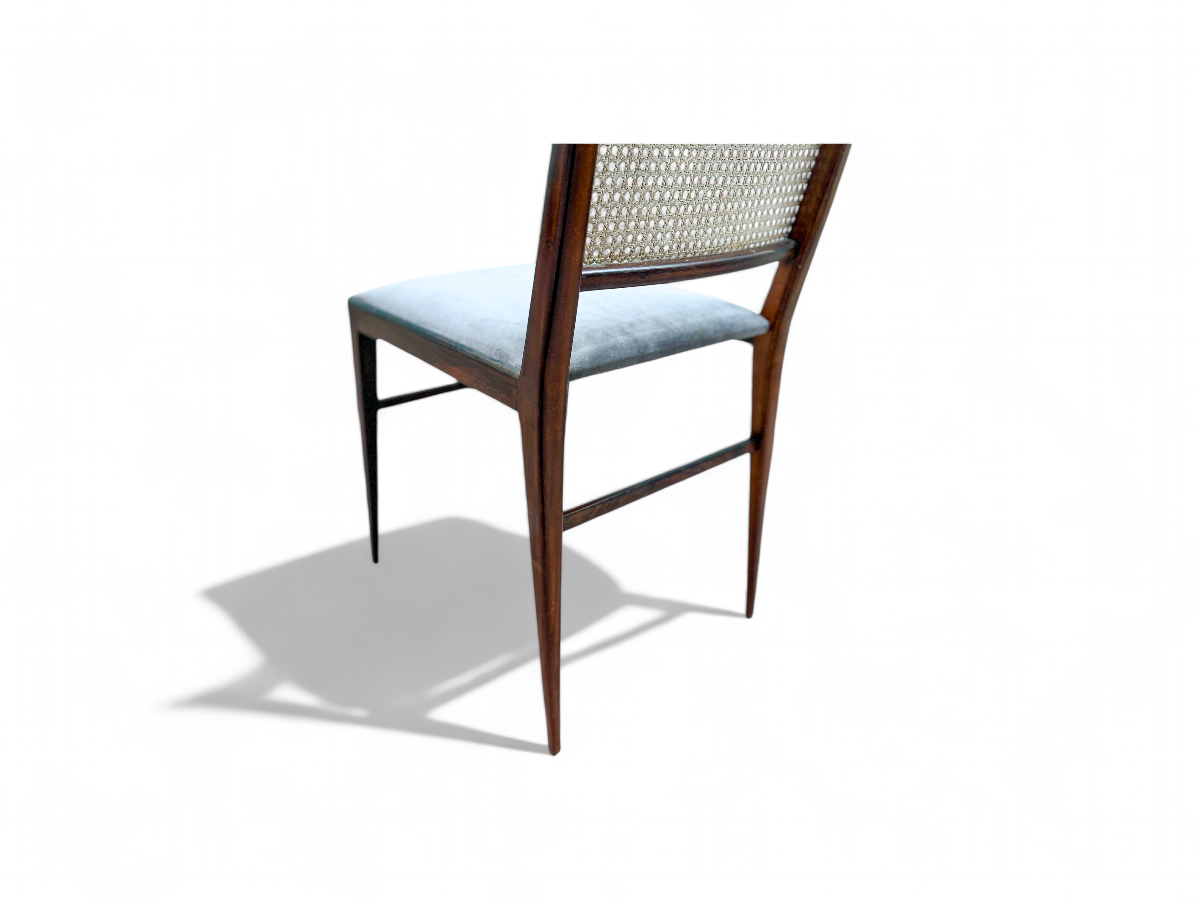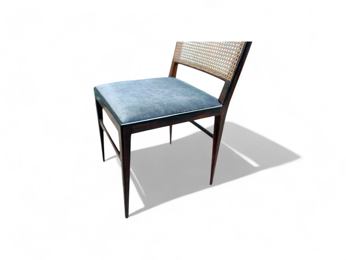 Each dining chair features a structure in Brazilian rosewood with four delicate long legs with the backrest in caning and the seat in its original ultra suede upholstery. The wood has been refinished and displays colorful veins that make the chair look almost alive. The caning is new for two chairs and original for the other two. This set perfectly represents the Brazilian Modernist movement in the sixties: straight lines, leather, and abundance in the use of hardwood.