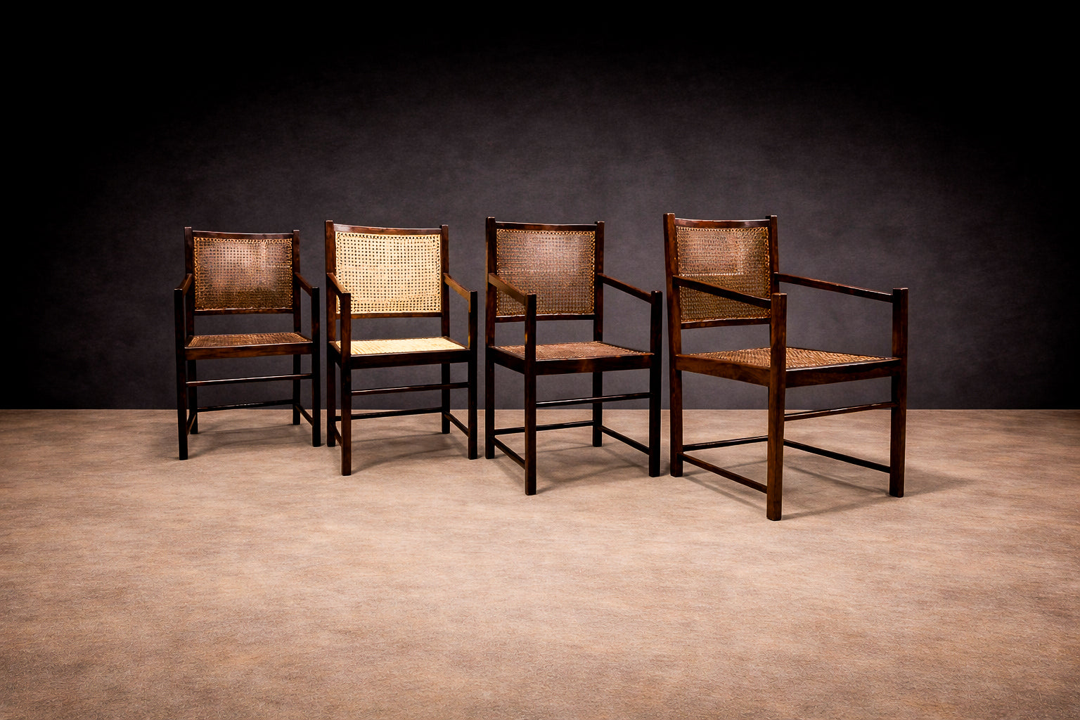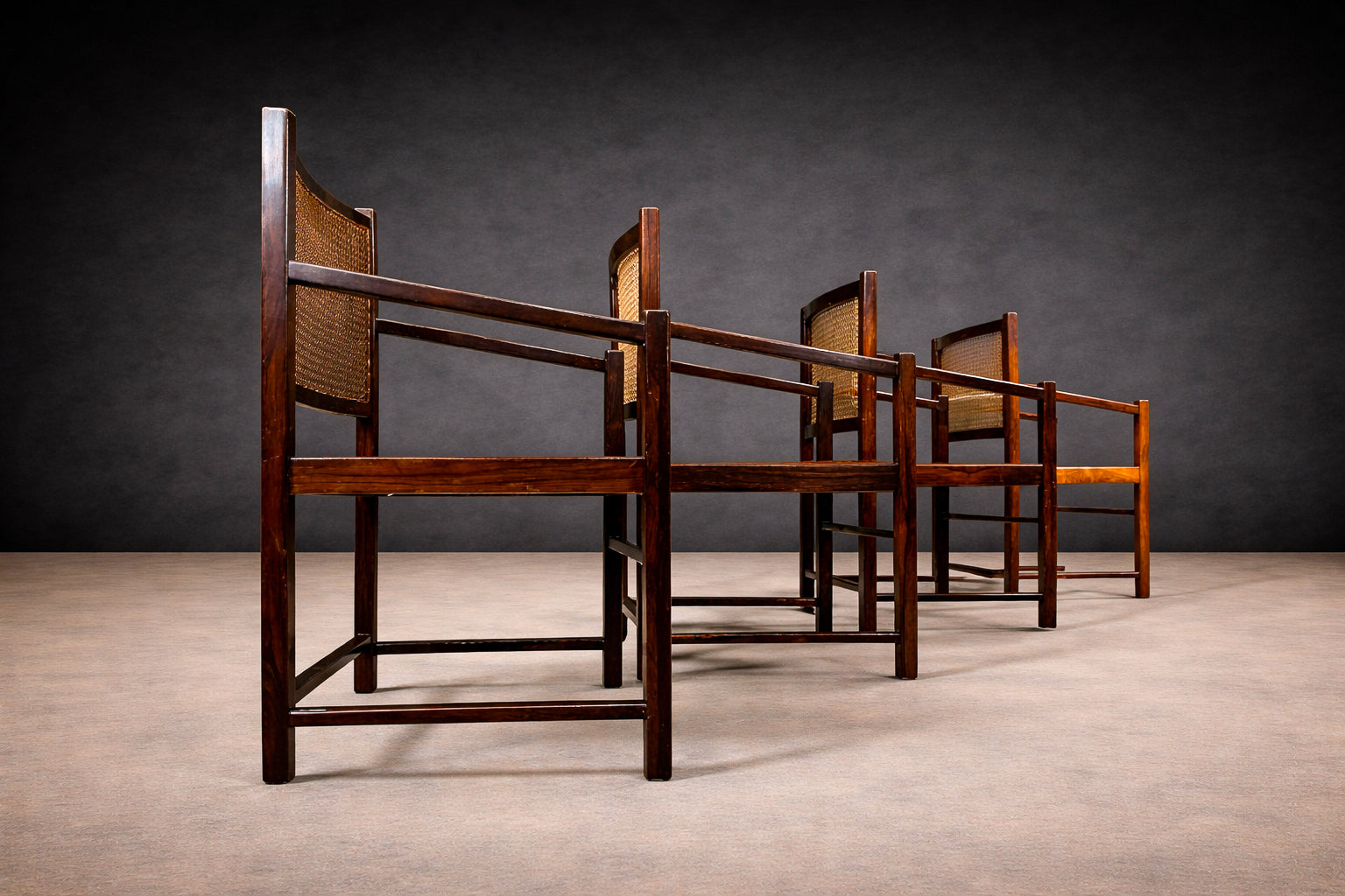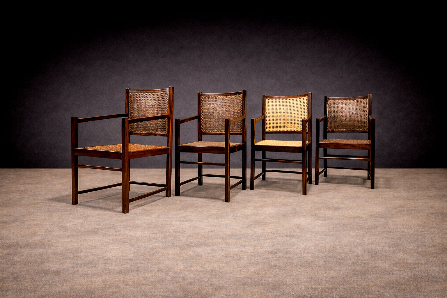 These armchairs are crafted from solid Brazilian rosewood and feature handwoven cane seats and backs, reflecting a material language closely associated with mid-century Brazilian modernism. The use of rosewood—valued for its density, tonal warmth, and expressive grain places emphasis on material integrity and skilled craftsmanship as primary design drivers.