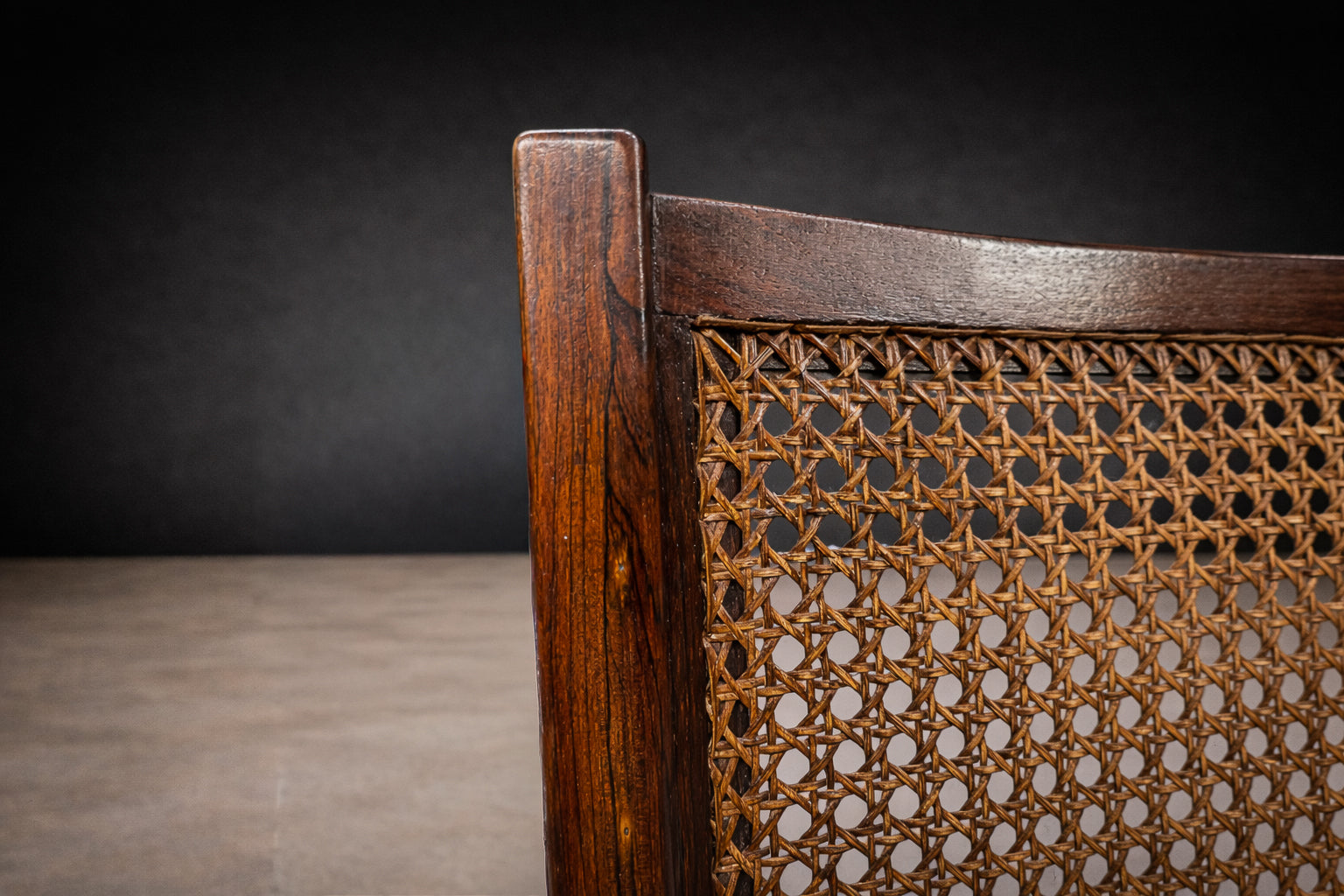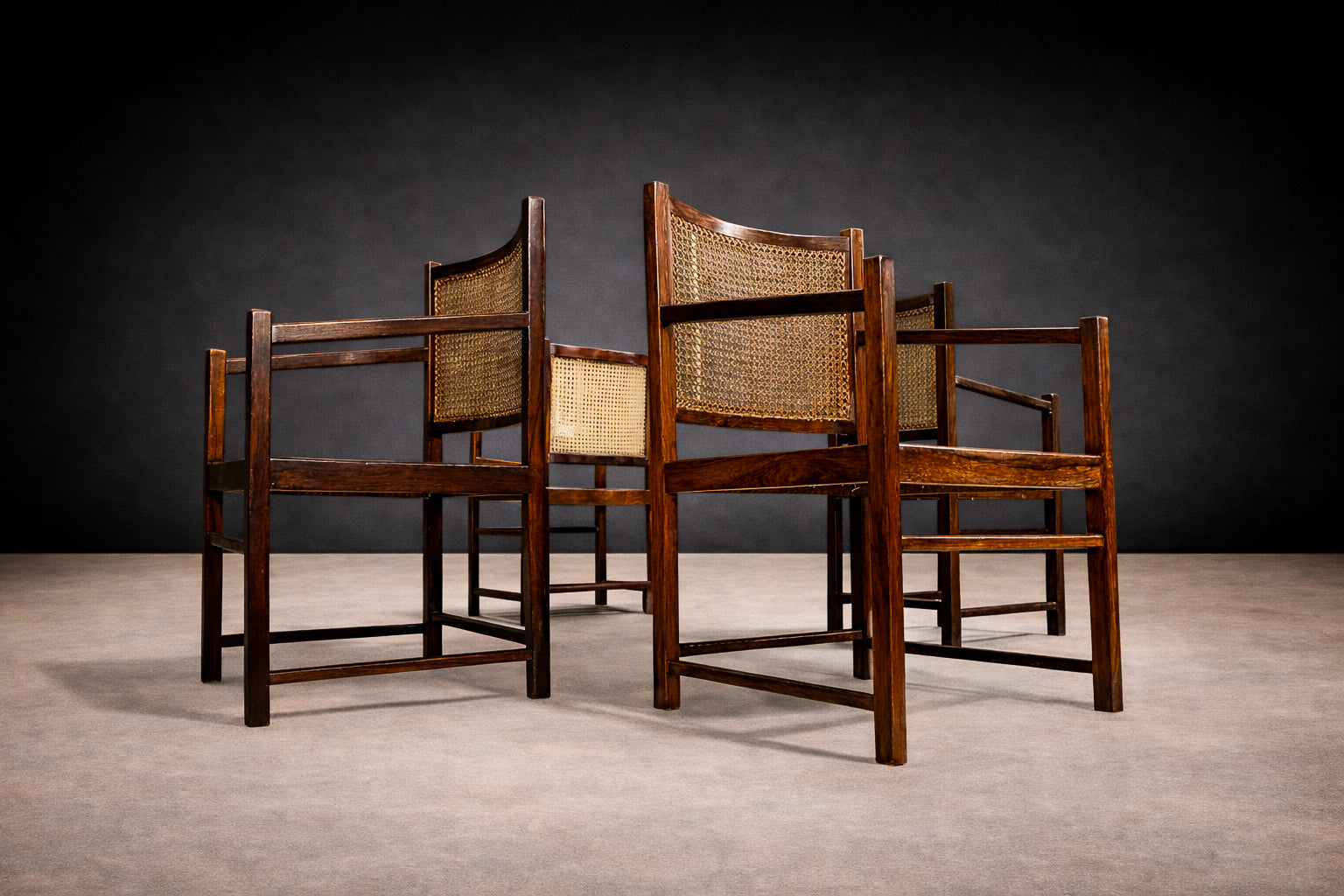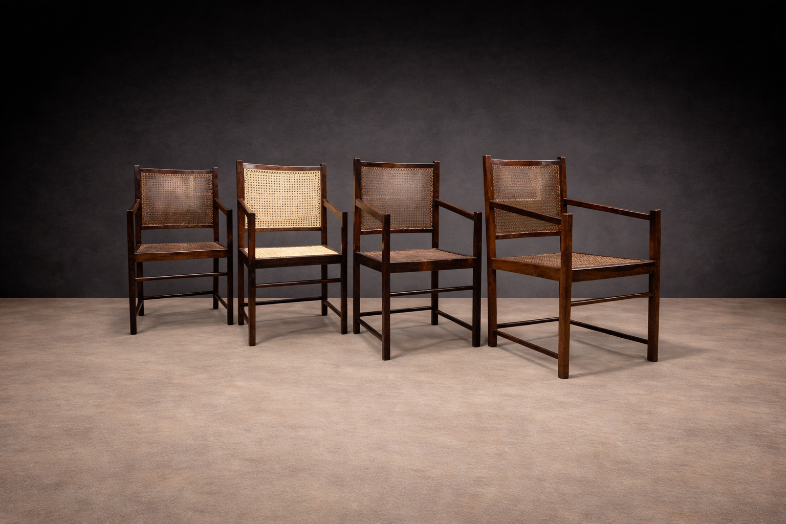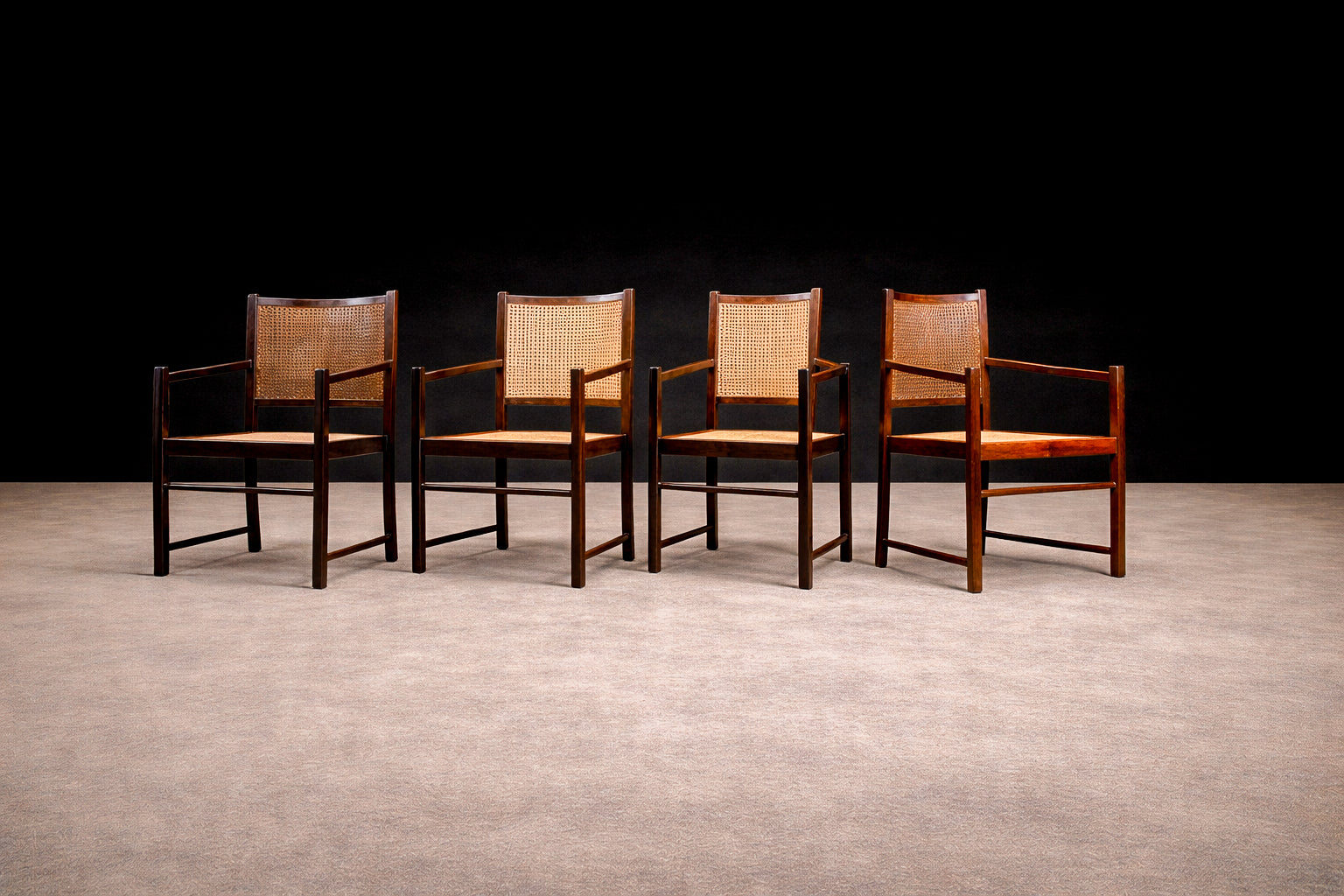 These armchairs are crafted from solid Brazilian rosewood and feature handwoven cane seats and backs, reflecting a material language closely associated with mid-century Brazilian modernism. The use of rosewood—valued for its density, tonal warmth, and expressive grain places emphasis on material integrity and skilled craftsmanship as primary design drivers.