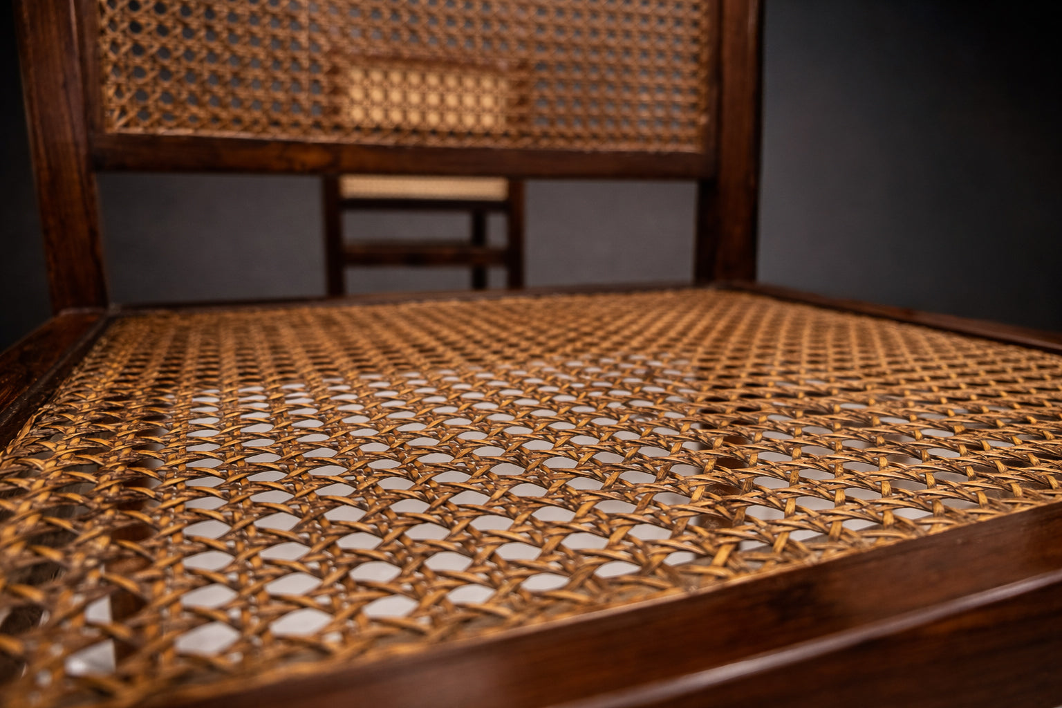 The form is defined by a restrained, architectural frame that balances solidity with openness. The woven cane panels introduce permeability and lightness, creating a visual counterpoint to the mass of the wooden structure. This dialogue between structure and surface allows the chairs to maintain a calm, composed presence while remaining visually engaging. Proportions are carefully resolved, with the cane surfaces integrated seamlessly into the frame.