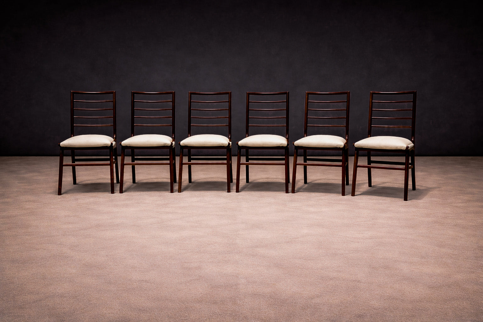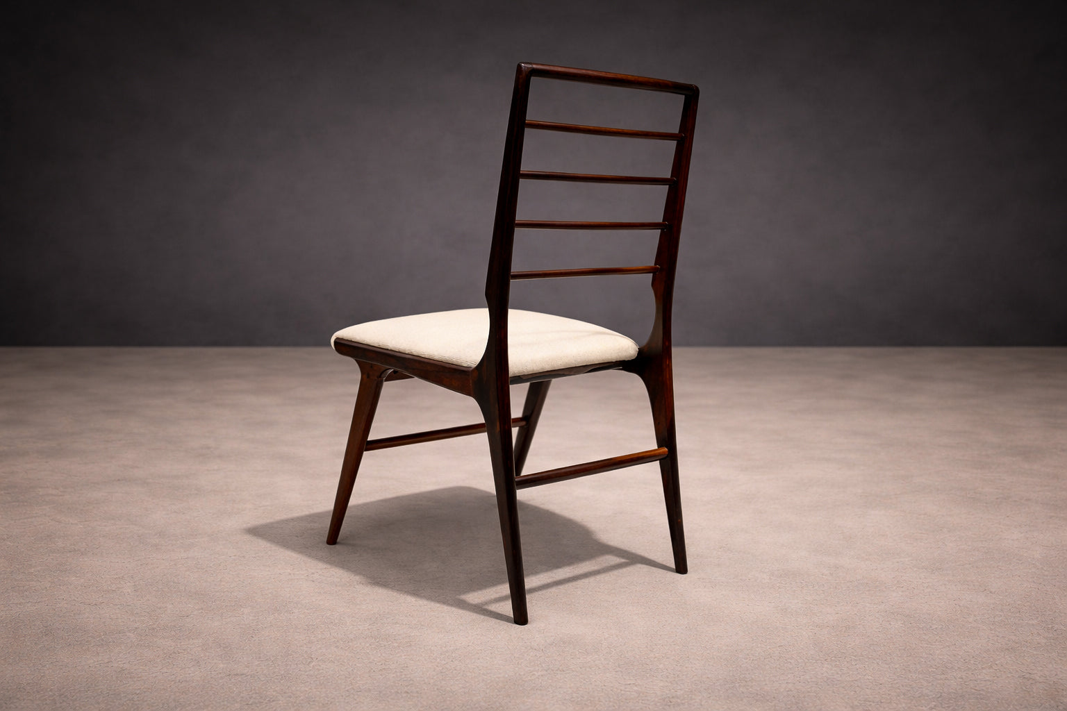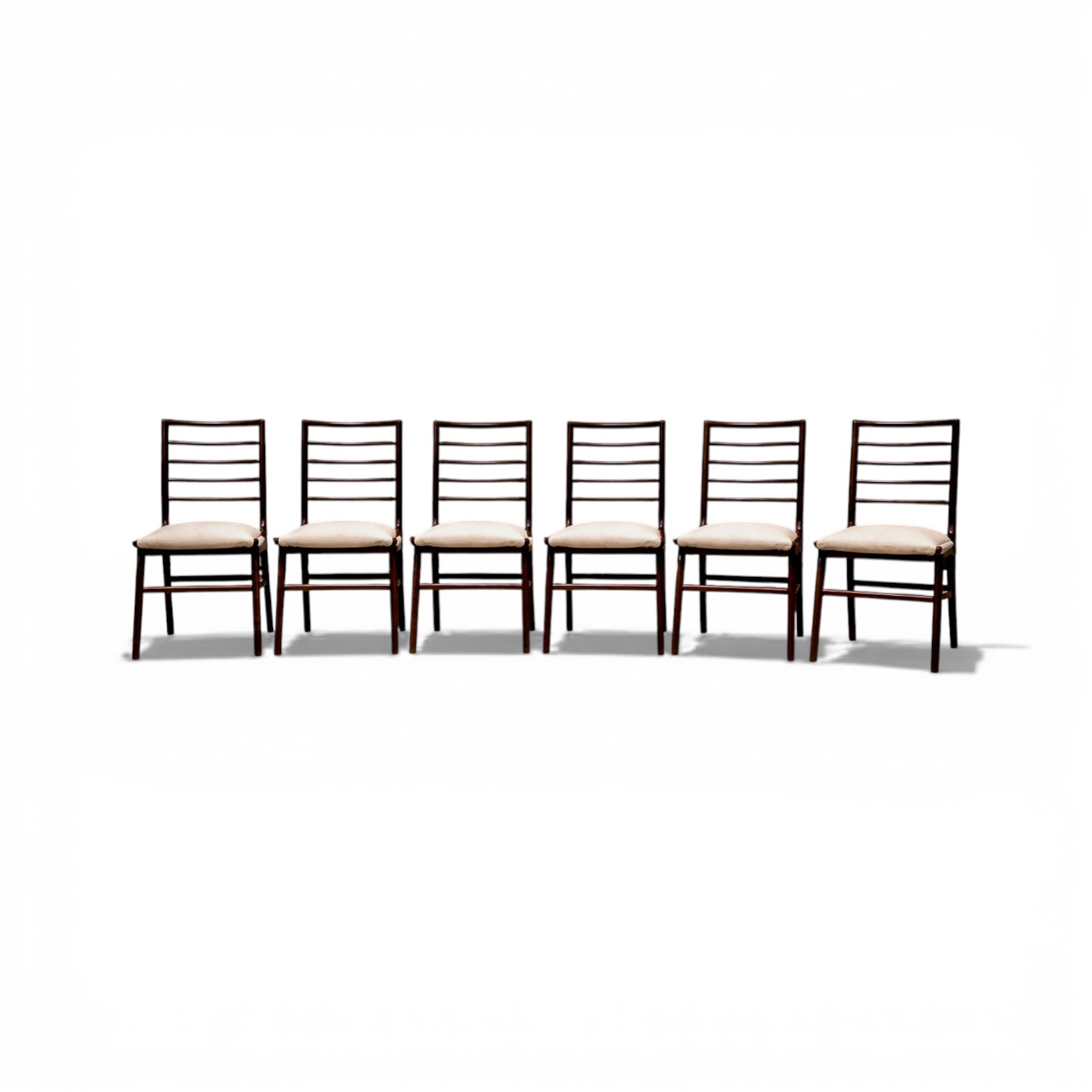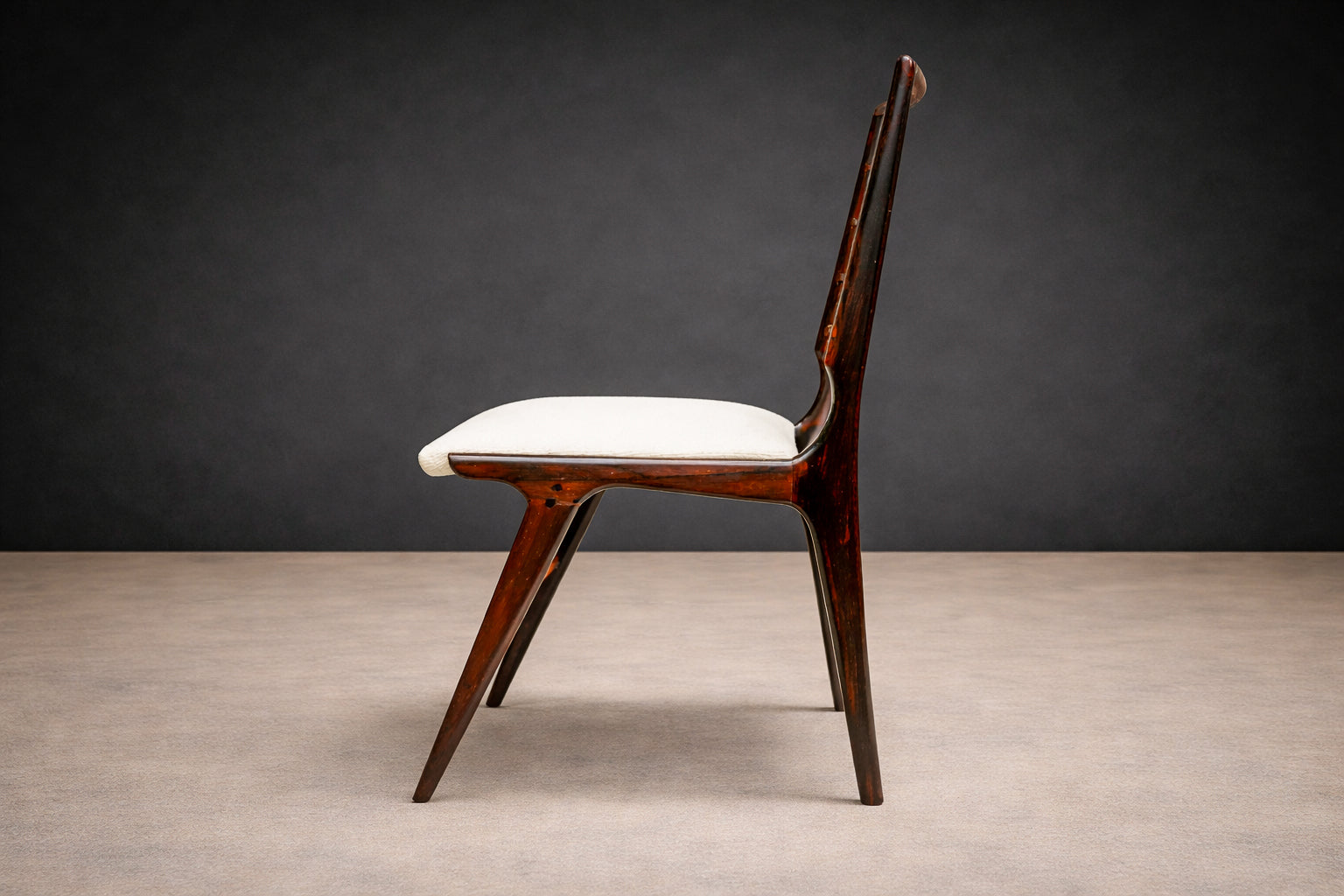 Crafted in Brazilian rosewood (jacaranda), the frames reveal the dense grain and deep tonal variation characteristic of the species. The wood has been carefully refinished to restore the clarity of the surface and highlight the natural figure of the material. The seats have been newly upholstered in a white textile, providing a restrained contrast to the dark rosewood frame. This pairing of dark hardwood with light upholstery reinforces the chairs’ balanced visual composition while maintaining the understated palette common in mid-century Brazilian interiors.