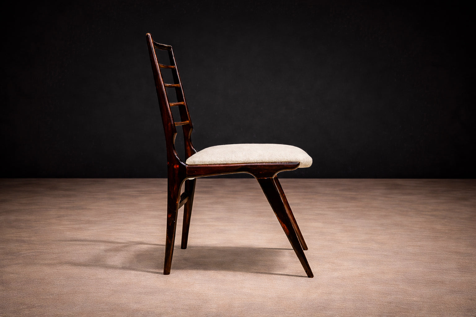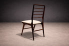 Designed by Giuseppe Scapinelli in the 1950s, this set of six dining chairs reflects the refined structural language that defined the designer’s contribution to Brazilian modern furniture. An Italian-born architect and designer who established his career in Brazil, Scapinelli developed a body of work distinguished by its careful balance between architectural rigor and the expressive qualities of Brazilian hardwoods. These chairs exemplify that synthesis, where slender proportions and disciplined geometry are paired with the visual richness of jacaranda.