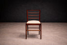 This set originates from a private residence and has undergone careful restoration, including refinishing of the rosewood frames and reupholstery of the seats. The structure of each chair remains stable and well preserved, with surfaces consistent with respectful conservation.