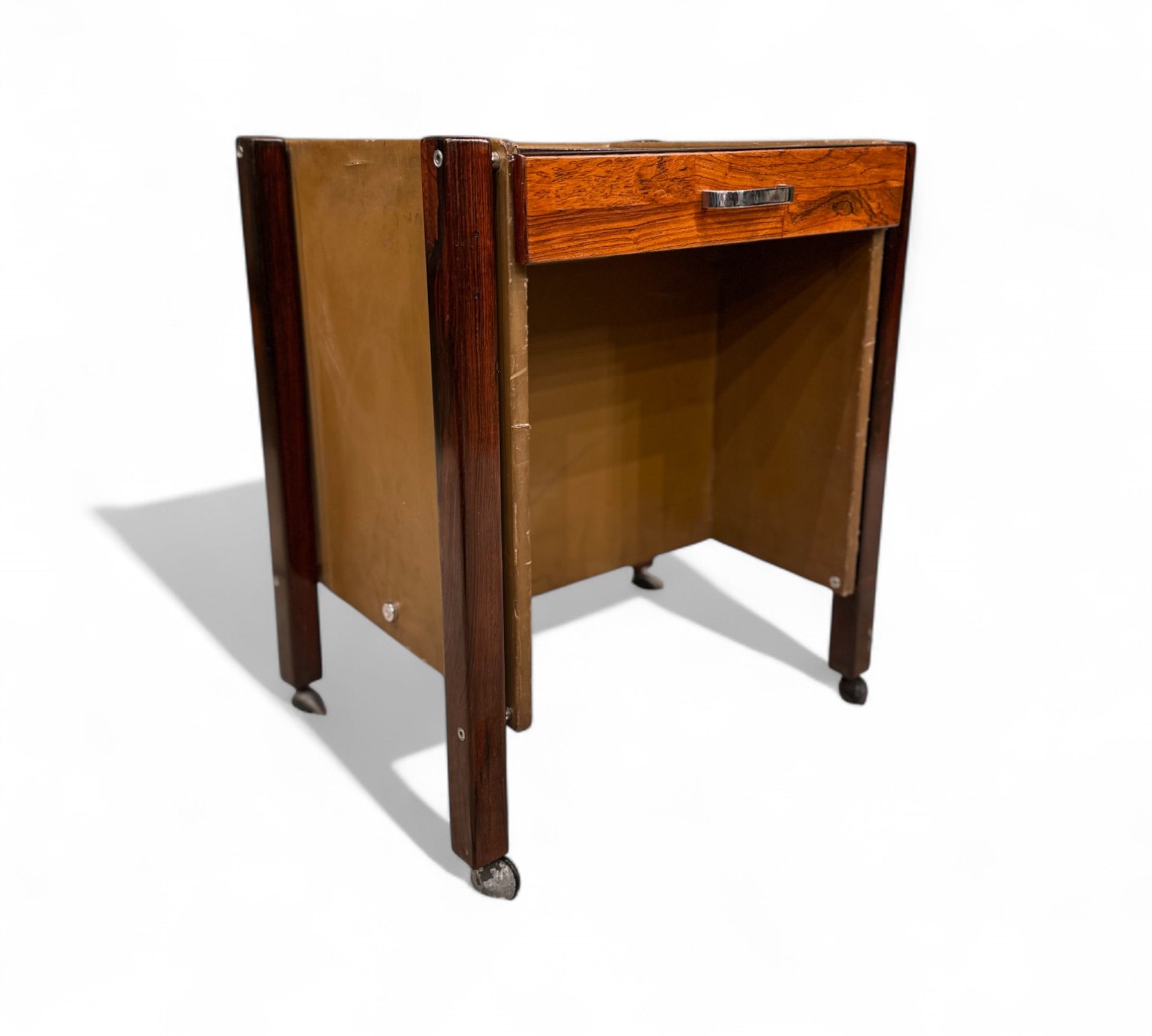 This side table is beautifully crafted from hardwood and finished with rosewood veneer. It includes a single drawer for convenient storage and is supported by four legs equipped with chrome wheels for easy mobility. The sides are adorned with leather, adding an elegant touch. This versatile piece can serve as either a side table or a file cabinet. The wood has been refinished, showcasing its vibrant grain patterns.