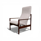 The composition is defined by a sculptural imbuia wood frame, its warm tonal variation and subtle grain lending depth to the silhouette. A disciplined linear structure anchors the design, while the gently reclined back and generous seat introduce measured softness. Slender supports and articulated joinery provide structural clarity, allowing the upholstered volume to sit lightly within the frame.