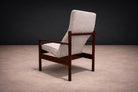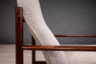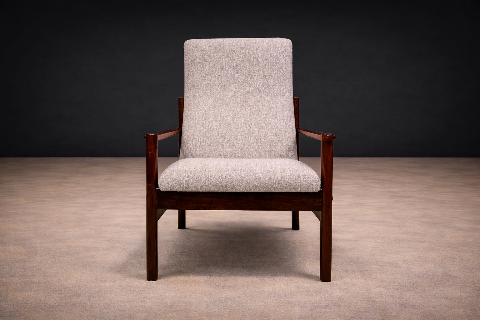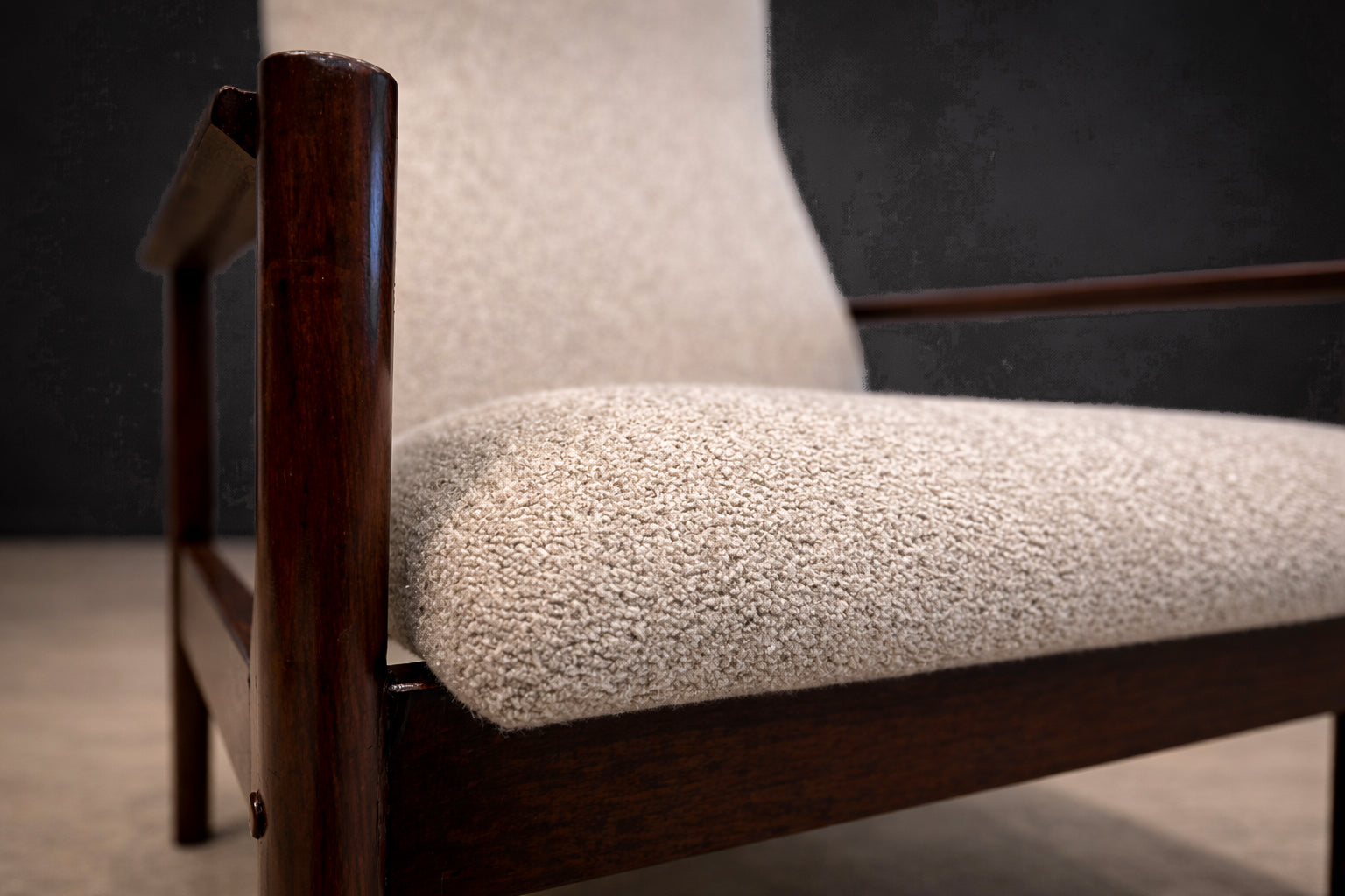 The imbuia has been professionally refinished to highlight its natural luster. The upholstery has been newly reupholstered in a grey bouclé, chosen for its tactile texture and quiet tonal presence. Comfort is integrated into the architecture of the chair, with ergonomic proportion guiding the experience of sitting.
