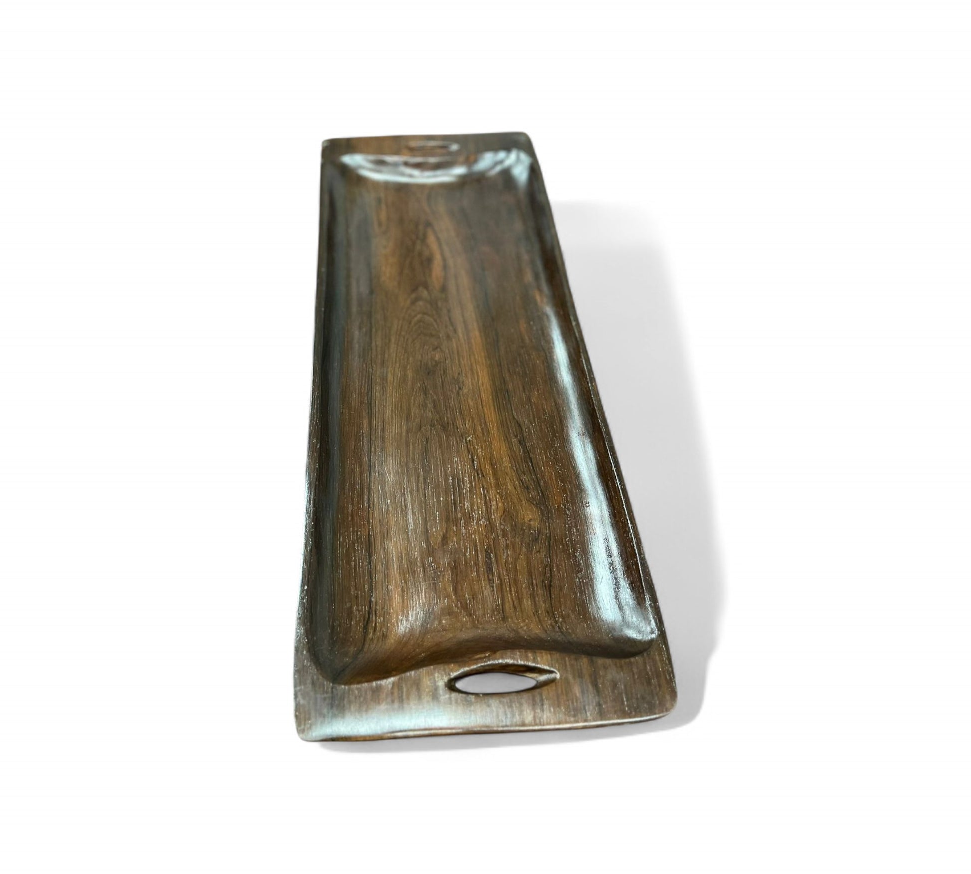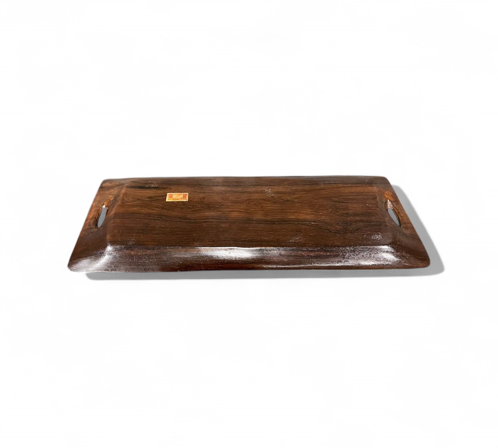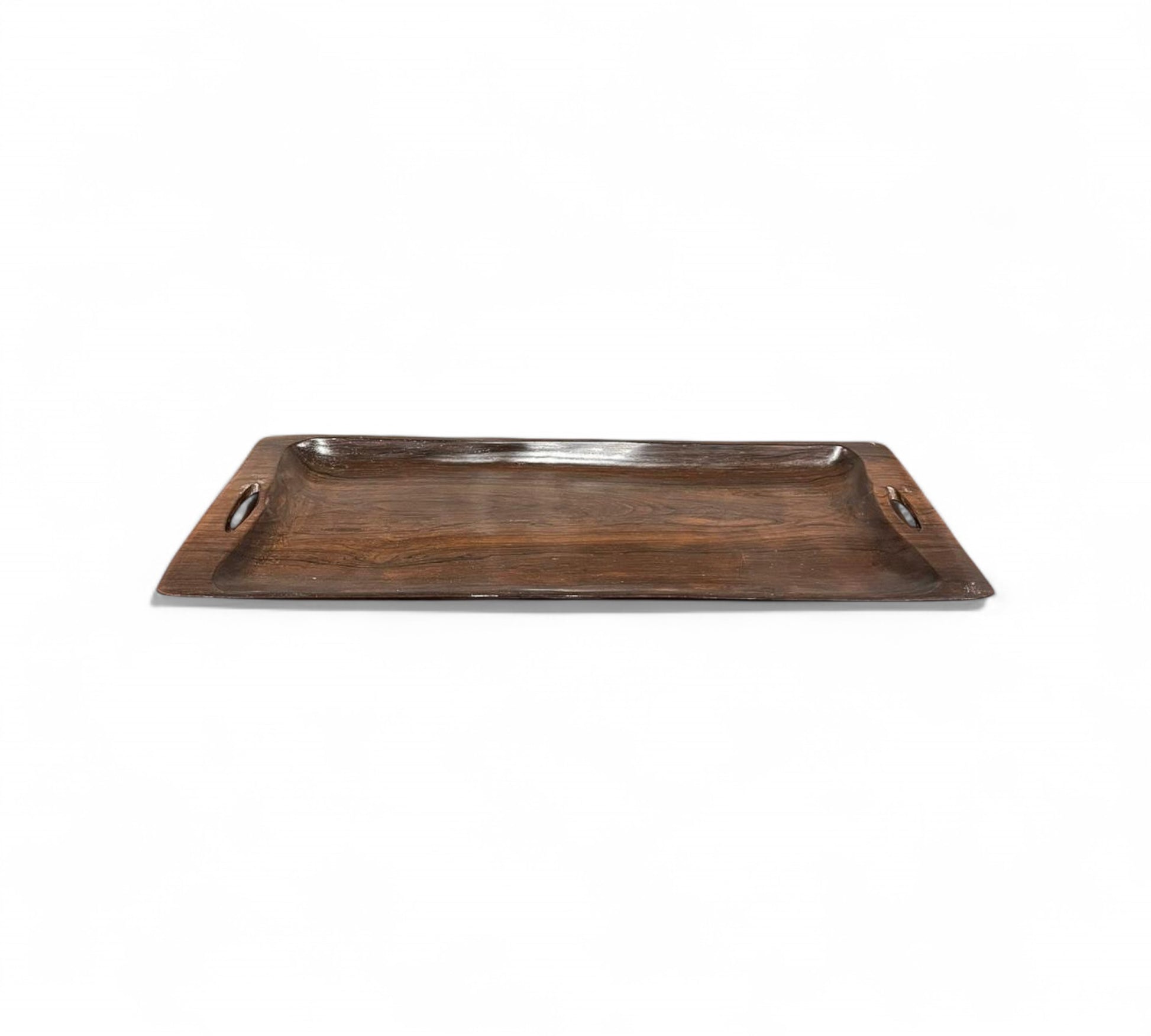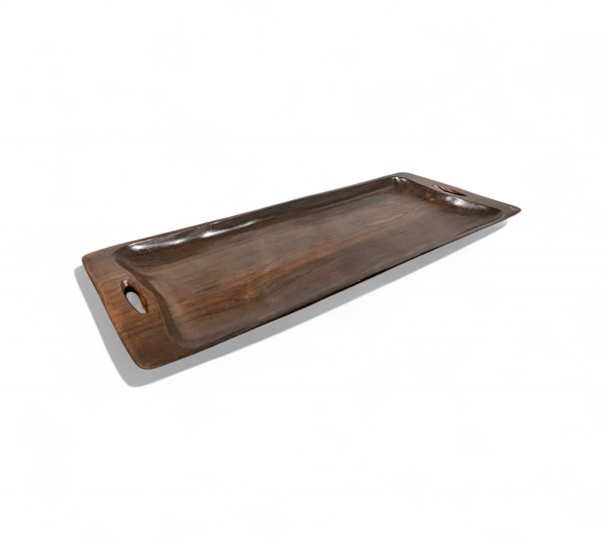 Handcrafted from hard rosewood (also known as Jacaranda), this tray features clean lines with elegant curves and two carved handles on each side. The rosewood has two rich tones with stunning natural wood grain on both sides. Pieces like this, with a minimalist aesthetic, are iconic from Brazil in the sixties, and were catered not only for domestic, but for international markets as well. This tray will look awesome as a centerpiece on a table or sideboard. The wood has been refinished and besides minor marks of age, the piece is in excellent condition.